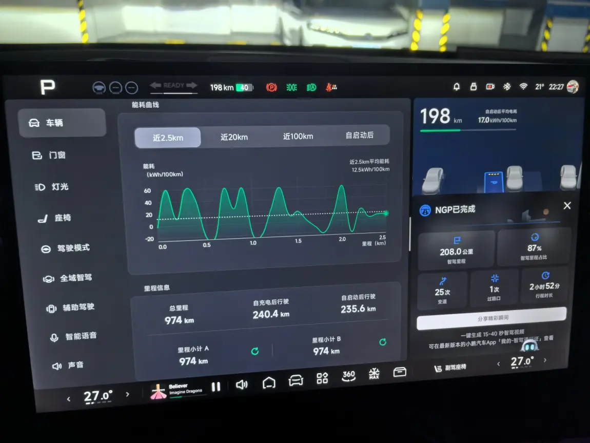4.续航:我开了一个星期下来,总里程跑了978km,家里的充电桩还没装好,都是在用小鹏自建桩充电,充满wltp显示494km,这个星期城区60%+高速40%,在城区电耗12.5,高速就要看时速了,100-110公里的话电耗为14-15,时速≥120km,电耗就高了许多(大概是18-20)。所以不赶时间的情况下110应该是比较高效又节能的速度🤣。