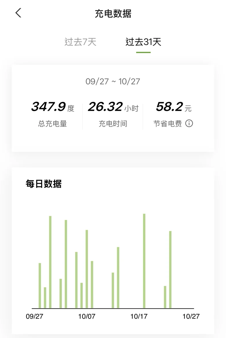 一定有很多朋友和我一样,不少朋友纠结电车的日常开销,其实对多数通勤党来说,每天就上下班开一圈,一年总里程真没多少,电费自然省到离谱!像我平时每月也就不到200多度的电,就拿10月份来说,赶上国庆中秋双节,加上日常周末频繁短途出游,截止到10月27日,才用到347多度。好在一直用小鹏超充,攒的积分直接抵扣,充电分文未花!(ps: 这福利真的太香了!)而且平日里,自从有了胖虎,我都想着给胖虎充上谷价电,按一度电0.65元算,这个月单充电就省了226元,比油车省太多啦~
