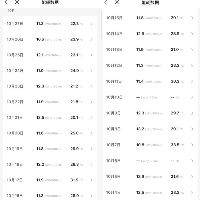 说起小鹏的能耗表现,我最想说的是我的胖虎,目前行驶里程已经达到了61333km,总结下来真的能永远放心!我的是P5 550E版,夏天城区开空调跑,能耗稳定在12-14之间,实际续航基本能做到1:1的精准匹配!而且我一直关着动能回收开,要是打开强回收模式,能耗还能再降一档!给大家看看我10月份,近期的实际能耗记录: