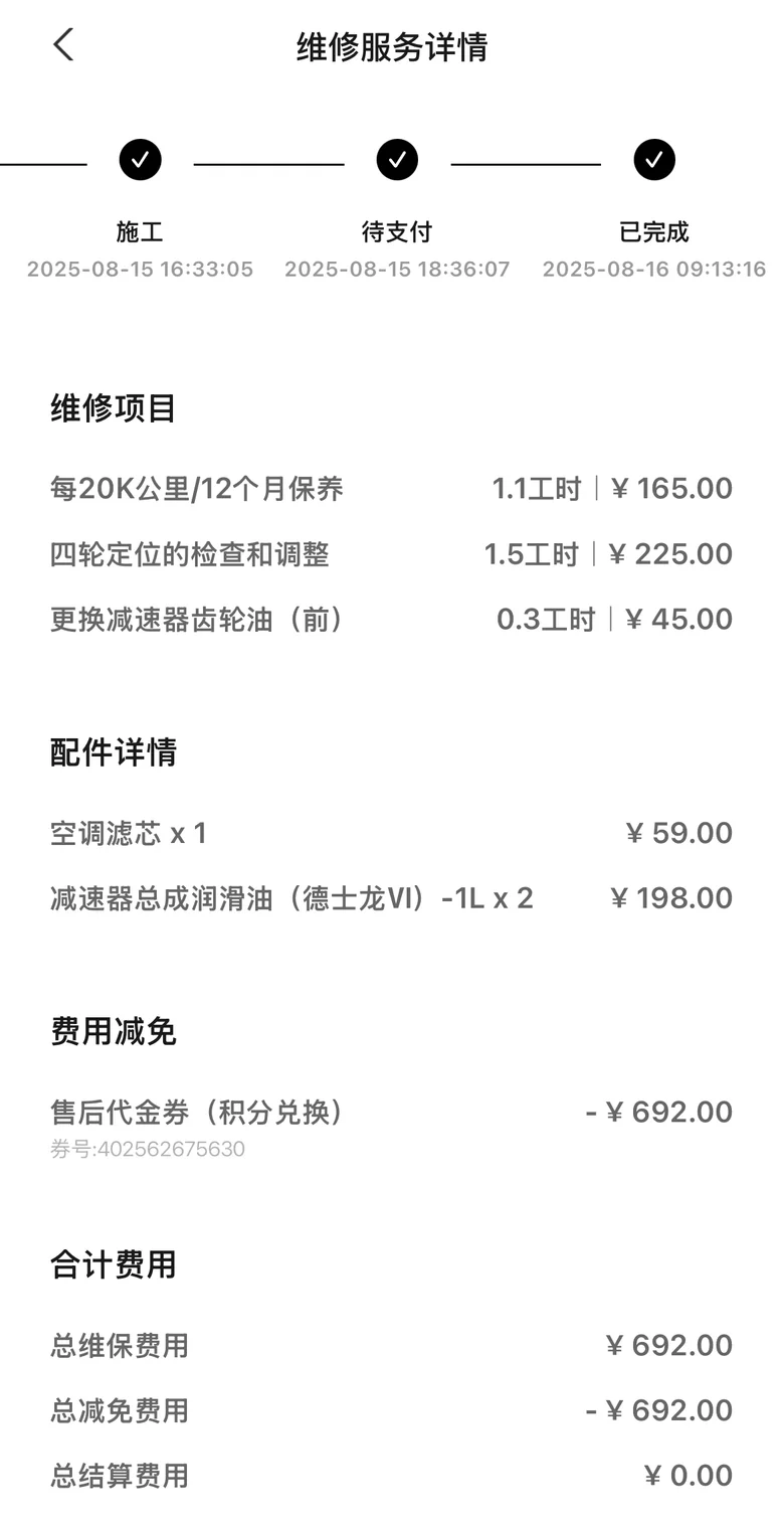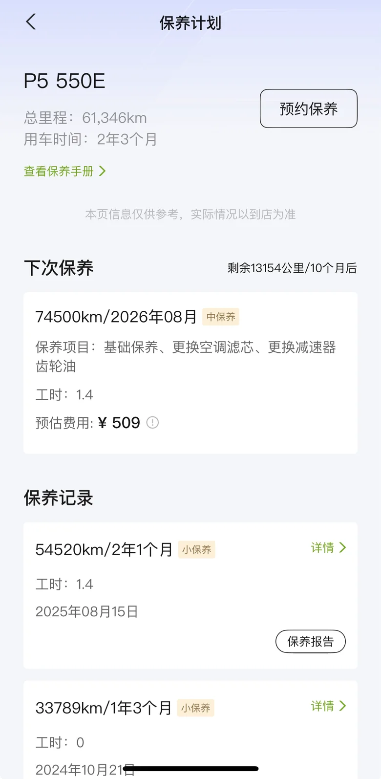 我的胖虎已经行驶了61333公里,这期间已经保养了五次。而鹏厂很贴心,保养政策改革,先前是5000公里一保养,后来改革成2万公里保养一次!加上入手胖虎后第一个5000公里首保免费,再到后来四次的保养,均在小鹏售后服务中心进行!有积分抵扣的同时,自己也只花费了不到500元!最最重要的还是鹏厂的贴心!保养的费用还可以用积分抵扣,这相当于又是免费保养了福利了!给鹏厂点赞!👍🏻