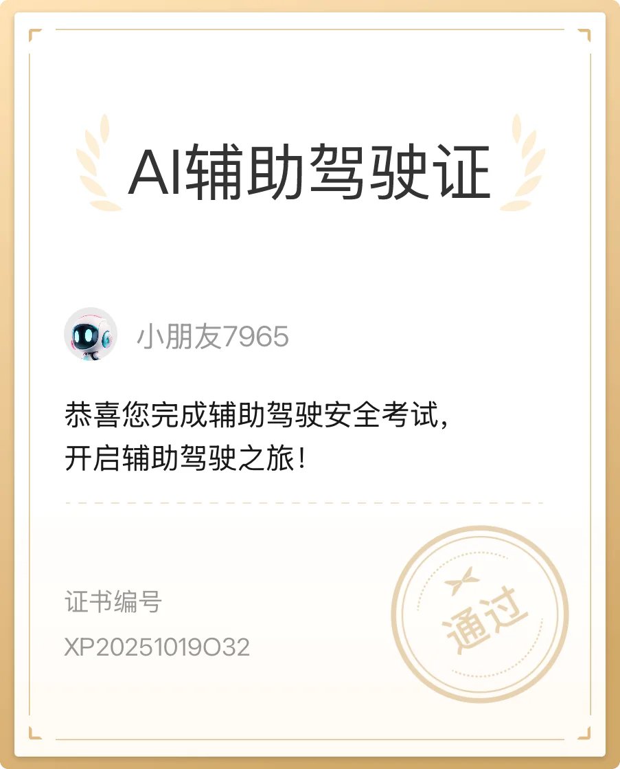 #智能驾驶证# 通过智能驾驶考试啦~终于持证「上岗」!喜提小鹏智驾「毕业证书」一张!🪪考前还小小紧张了一下,生怕通不过。认真看完视频和考题才发现,这不仅是考试,更是一堂生动的「人机共驾」安全必修课。它让我彻底明白了,智能辅助驾驶不是「自动驾驶」,而是我们最得力的副驾。从今天起,和“小P”的默契更上一层楼!期待在NGP的加持下,开启更轻松、更安心的旅程。🚗✨有没有鹏友一起,路上见呀!