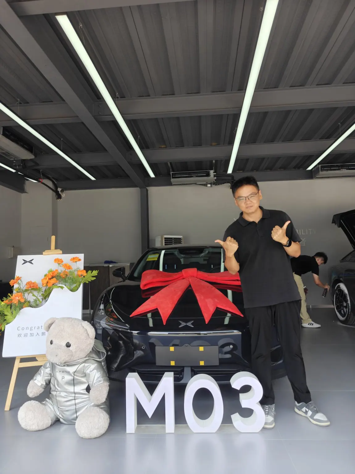 #我的提车作业# 我的小鹏M03提车记🎁🚗 提车现场直击- 一大早冲进交付中心,黑武士M03扎着大红蝴蝶结等我,旁边还有戴耳机的宇航员小熊🐻,仪式感直接拉满!💺 车内初体验- 黑色内饰高级感绝了,座椅摸上去软软糯糯,后排空间比想象中能装开回家路上试着喊"你好小P",导航、开空调秒响应💡 新手碎碎念- 续航实测:提车时显示480km,开了30公里市区路掉电28km,这表现我给💯!#小鹏M03 #新能源提车 #我的第一辆电车