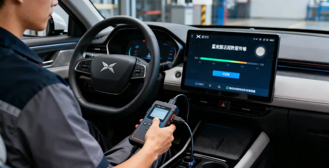 赶到服务中心时已经快11点,这里依旧灯火通明,技师早已准备好设备等着。特意拍了几张照片:一张是我的小鹏G7停在服务中心的样子,夜晚灯光下车身线条超清晰;两张星夜服务场景图,一张是技师在车内用平板检测系统,另一张是他连接设备调试的背影,全程认真又专业;最后还拍了一张APP上的服务进度界面,实时更新处理状态。