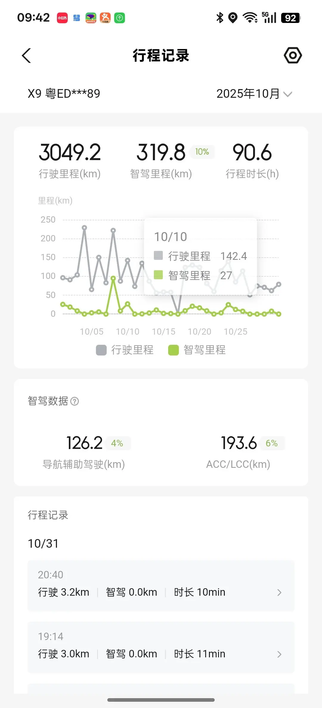 #我的10月用车总结# 十月份开了三千公里,能耗低用车成本也低,电车还是爽歪歪。由于是Pro版本,辅助驾驶就没使用多少了,也没有出去自驾游。不过偶尔用一下LCC也是很快乐,城区快速路用LCC反而更方便,都不用开导航。快速路一般也支持ngp,塞车不想开的时候也是用得舒服。这个月还经常在车上睡午觉,车上随时随地睡觉非常方便灵活,虽然没有在家睡床那么舒服,但是胜在方便,累了随便一躺就行,累的时候还是可以在车上睡着的。现在的车又能开又能睡觉,还有冰箱彩电大沙发,这你受得了吗@鹏友俱乐部