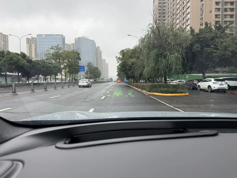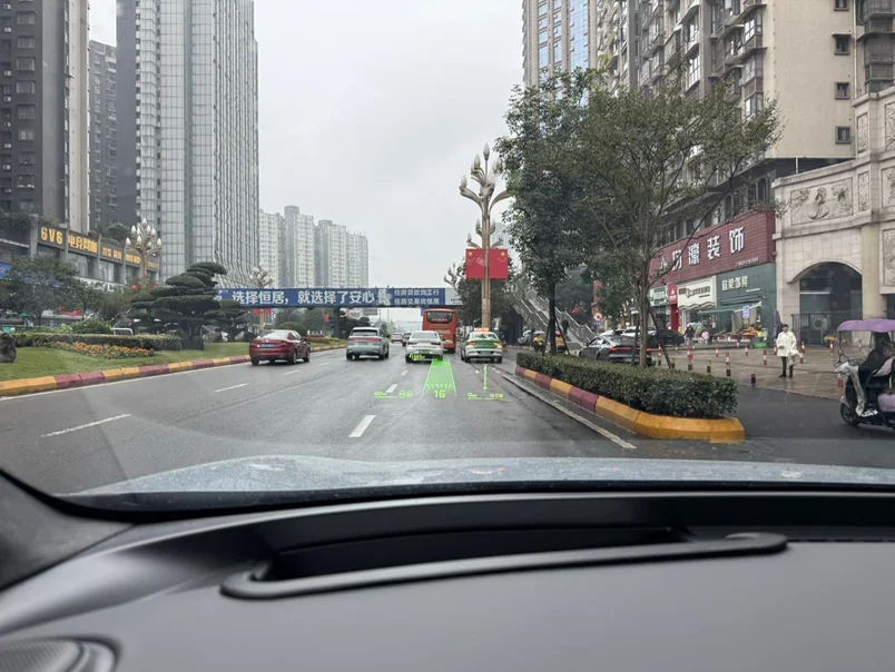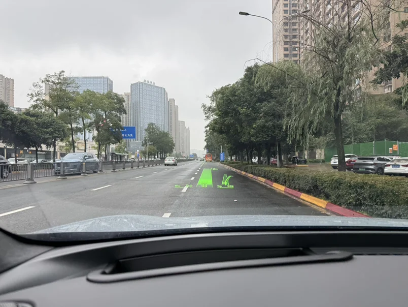 雨天通勤更不用说,雨水模糊了视线,路面标线变得难辨,AR-HUD直接把清晰的车道线投射在前方,跟着指引走,心里踏实多了。最惊喜的是窄路会车,作为刚开新车的我难免有点紧张总怕剐蹭,它能实时探测周边障碍,给出安全通行提示,几次下来,我也敢从容应对窄路了。