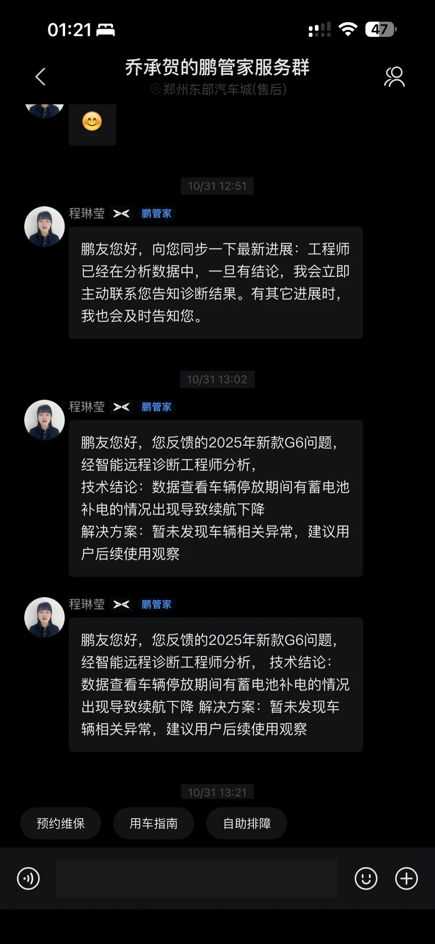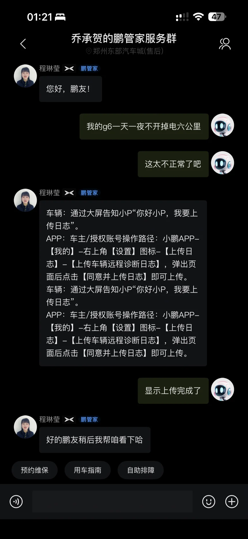 小鹏远程诊断帮我解决“停车耗电”难题,智能服务太省心🔋家人们,你们的小鹏会在停车一天的情况下掉电吗?我前段时间就遇到了,车停着没开,一天居然耗了6公里的电,可把我急坏了。赶紧用了小鹏的智能远程诊断功能,提交问题后很快就有服务人员跟进。经过远程检测,原来是车辆在给蓄电池补电,属于正常的车辆维护操作,这下我就放心了。整个过程不用出门,在APP上就能完成诊断,小鹏的智能服务真的很硬核,把车主的小担忧都考虑到了,这种足不出户解决车辆问题的体验太赞了!(附图:远程诊断服务记录截图、车辆电量变化记录图)#小鹏汽车 #智能远程诊断 #小鹏智能服务