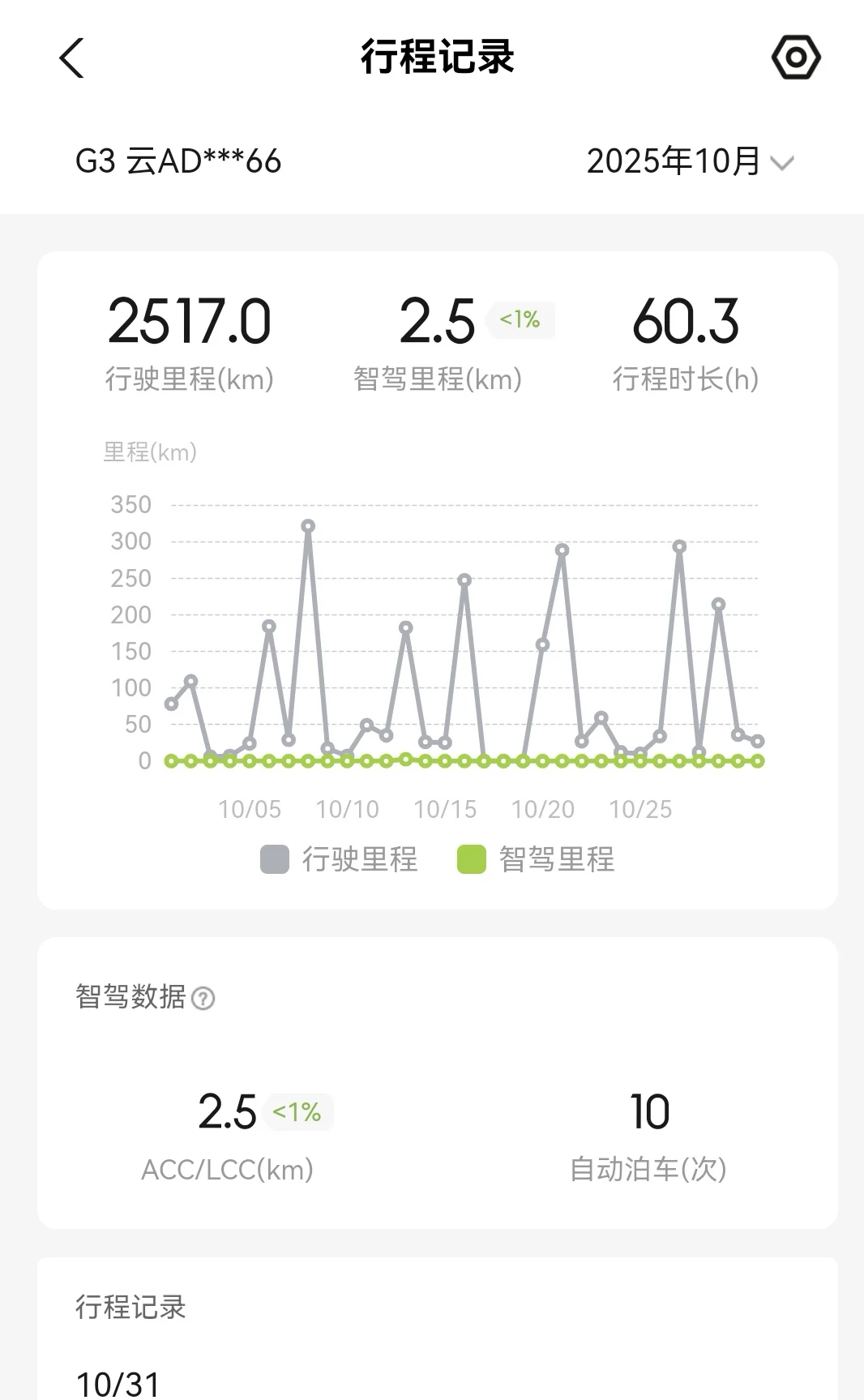 十月一共行驶2517公里,耗电436.3度,一度电约跑5.8公里。