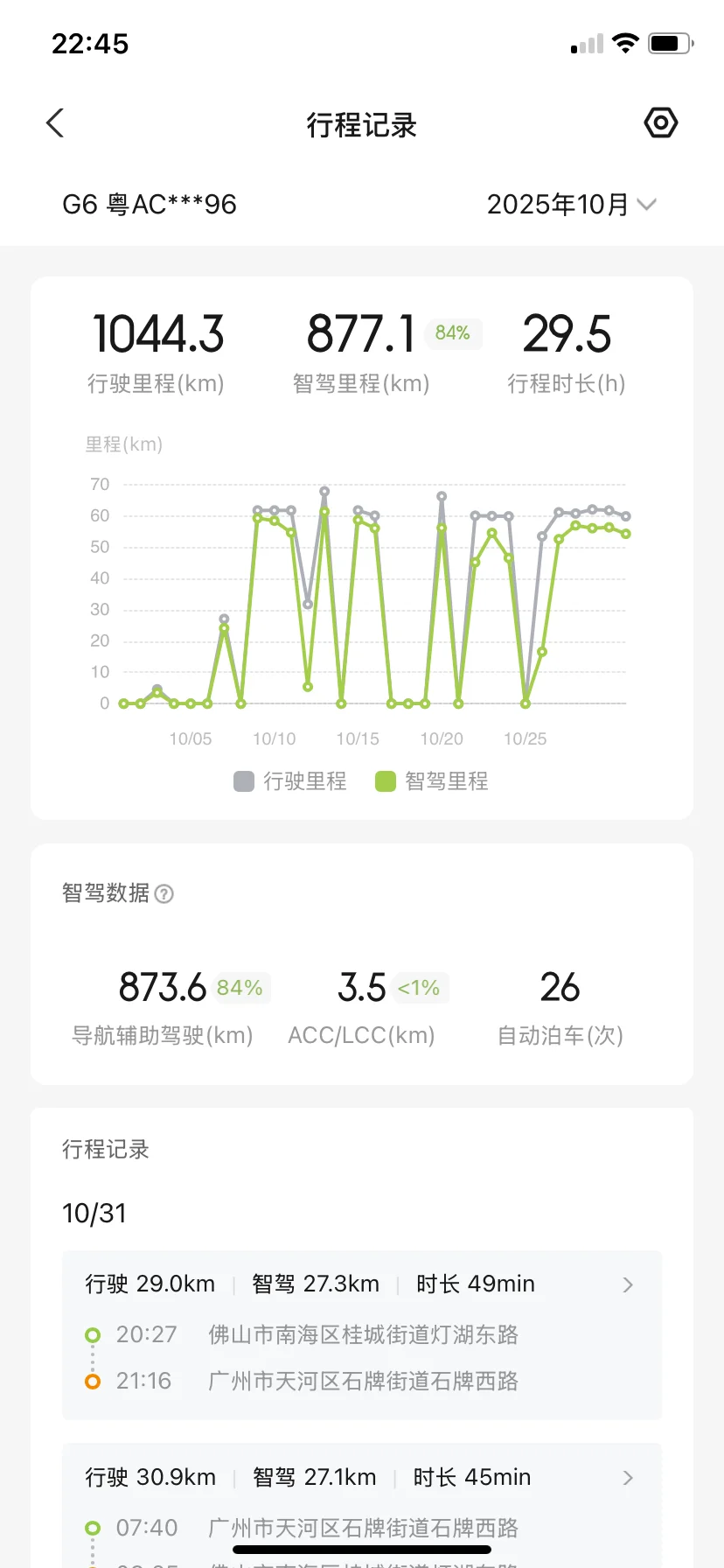 #我的10月用车总结# @鹏友俱乐部 提车半年,小鹏G6 25款725版本的十月表现依旧让我很惊喜!整个10月累计行驶1044.3km,其中智驾里程877.1km占比84%,总用车里程已累计达5122km,智驾早已成为我通勤的刚需。本月升级XOS 5.7.8.8906系统后,新增的人机共驾功能相当丝滑,每次深夜加班后回家,智驾总能帮我卸下一天疲惫,太舒服省心!月底完成首保,提前两周预约后到店体验很棒,休息区环境舒适,等候时安静放松,虽然保养车辆多,等了2个多小时,但免费午餐味道超出预期,服务质感拉满。作为广佛通勤候鸟,我每天来回60多公里,满电WLTP 569km的续航,实际能开到400多公里仍余20%+电量,高达成率让我一周充一次电就够,跨城通勤丝毫没有续航焦虑,10月份的用车体验越用越满意!