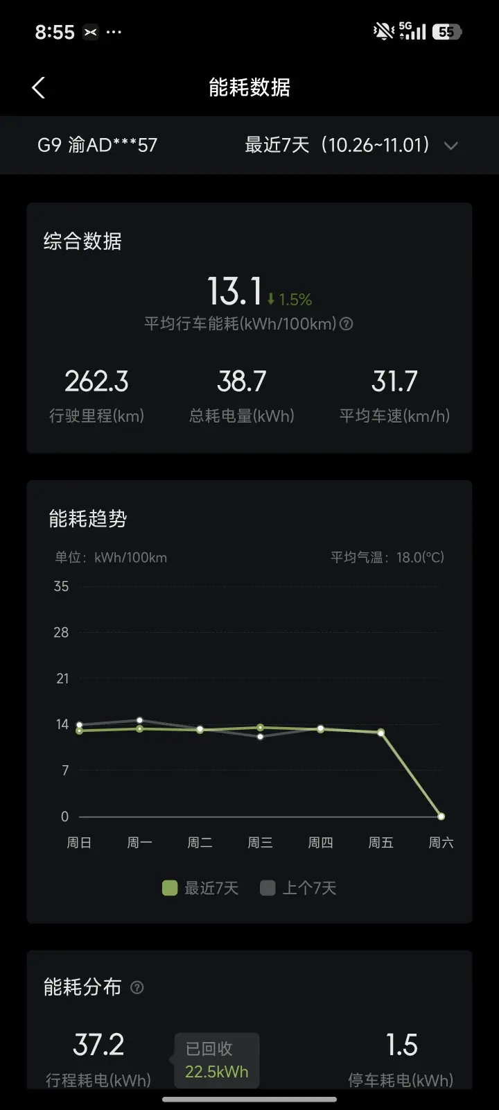 这周基本上都是市区通勤,加上温度也不低不高,能耗就降了不少。