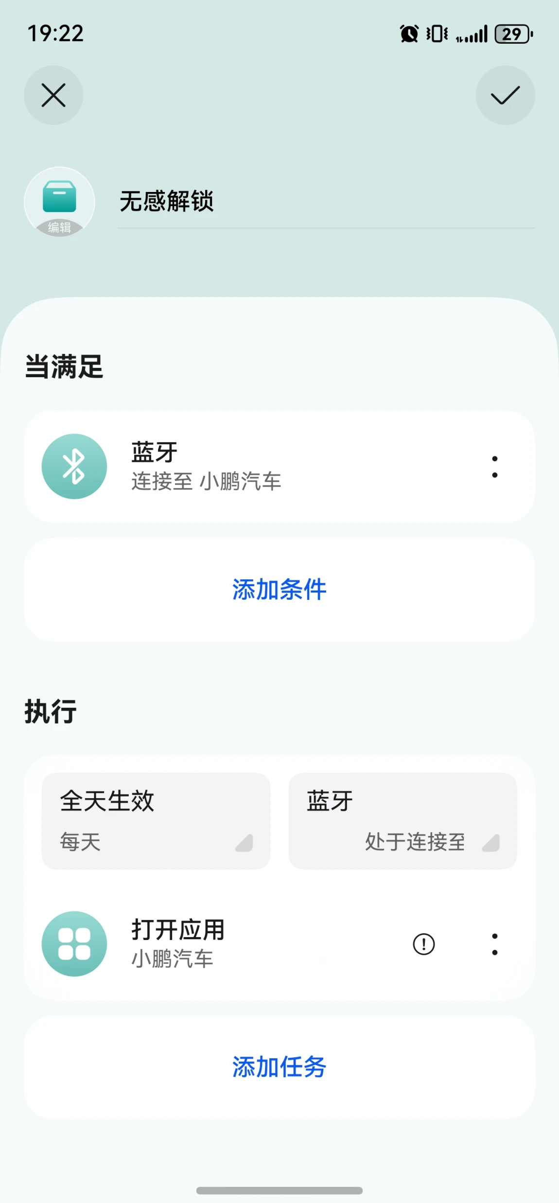 通过华为智慧生活场景实现让小鹏汽车无感解锁,按照图片上设置不需要打开APP 靠近车或者拉门把手实现解锁 亲测有效
