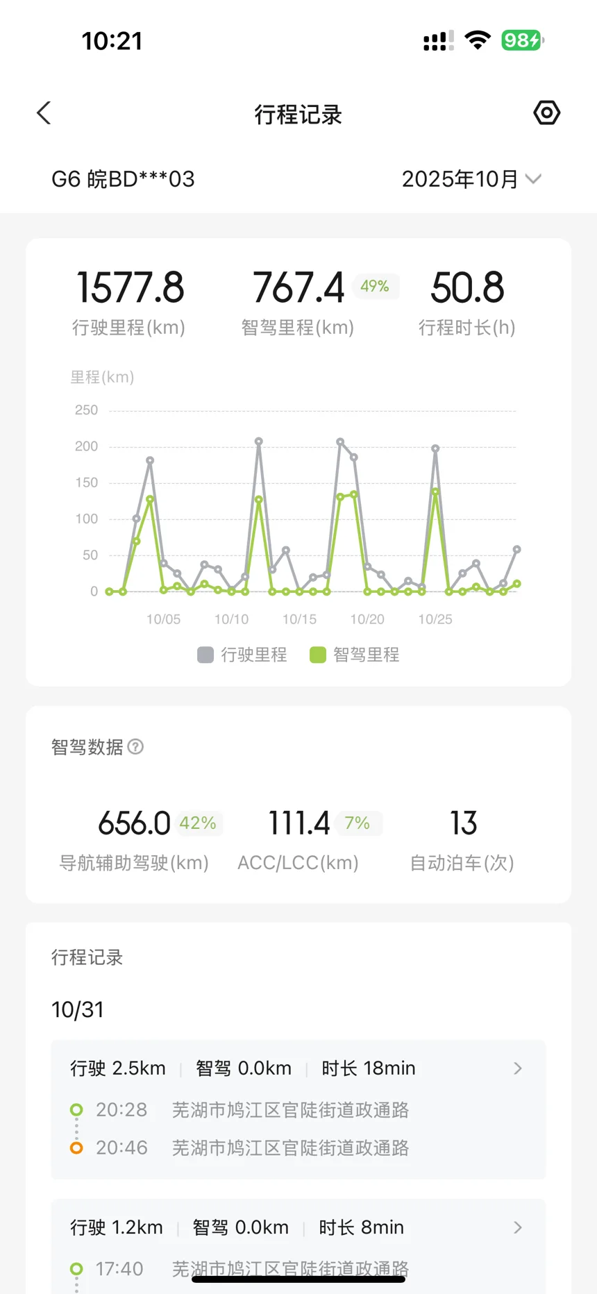 #我的10月用车总结# 10月份一共开了1577公里,其中智驾767公里,大约占到一半,基本是周末带女儿训练网球,高速用辅助驾驶太香了,高速占比比较多,辅助驾驶的含金量就提升了很多,给我的驾驶提升了非常多的安全感和便利性,疲劳降低六成,我对小鹏的智驾是充分的信任了!能耗方面我截取了高速占比47%的一周,数据是电耗17.1,这个数据相当厉害,我的高速驾驶习惯基本是定到130顶着限速,这个能耗着实优秀,不得不佩服鹏厂的实力!另外不得不提的是10月初,我的车在异地的小鹏服务中心修好了,服务非常周到,包括跟保险公司的对接,订货,维修等等,让我最大程度的减小事故带来的损失,感谢小鹏的服务。另外小鹏提供的高速免服务费点卡和目的地超充太方便了,充电速度超级快,丝毫没有续航焦虑,还有很多超值的充电减免活动!@鹏友俱乐部