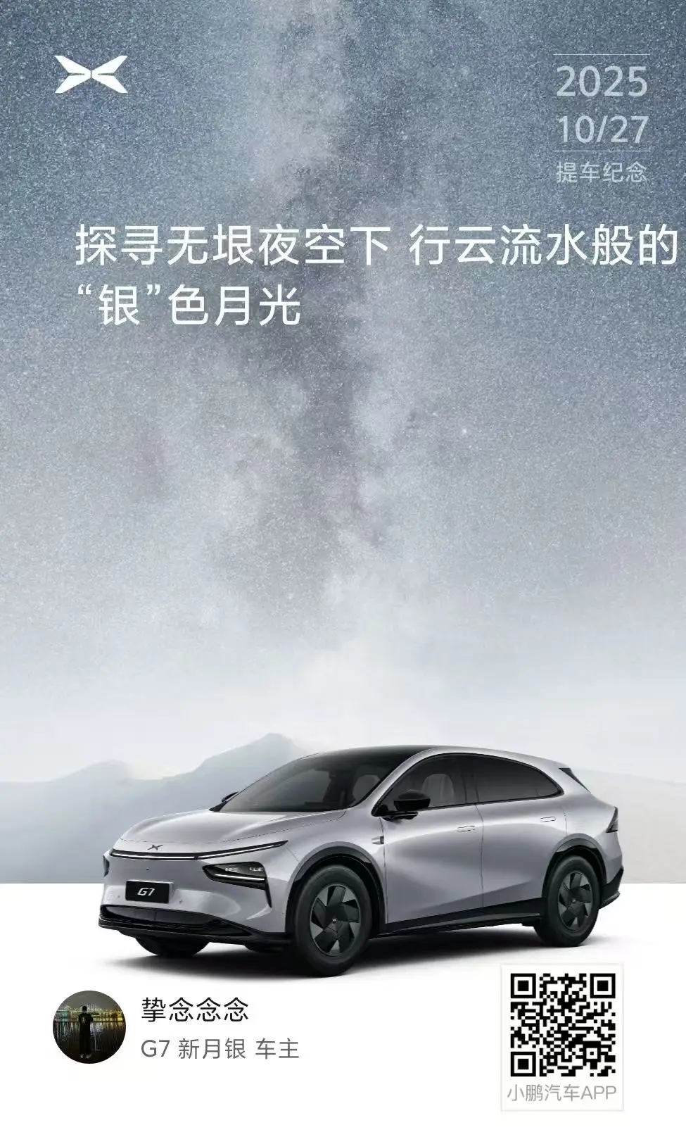 #我的10月用车总结# 10月27日提车那天的兴奋劲儿至今未散,从交付中心接过钥匙,看着属于自己的小鹏G7静静停在那里,连验车时都忍不住反复确认,每一项都非常符合我的预期!@鹏友俱乐部 简单完成交接仪式后,便开启了一百多公里的返程之路,全程开启NGP,车道保持平稳,并没有鹏友们说的偏右的问题,遇到慢车还能主动判断时机超车,原本担心的长途疲劳感减轻了大半。新车的“新鲜感”藏在细节里。车门开启时的迎宾光毯夜晚点亮时格外有仪式感,AR-HUD把导航信息清晰投射在前挡风上,连家人都直呼新奇 。语音控制“小P”调节空调、开启座椅通风特别顺手,256色氛围灯随音乐律动,这些小设计让每次出行都多了份愉悦。提车第三天就第一次洗了车,看着水珠从流畅的车身滑落,洗完后的G7在阳光下更显精神,那一刻真切觉得“精心对待很值得”。 这段时间的用车体验,最惊喜的是续航表现。日常通勤去县城购物或者出去跑步,从提车到现在综合能耗只有惊人的11点几,完全超出了我的想象!从提车首日处处爱惜的胆战心惊,到如今成为日常通勤的可靠伙伴,小鹏G7的智能与实用慢慢融入生活。它不仅是代步工具,更像个懂需求的出行搭档,期待接下来能开着它去更远的地方,解锁更多行驶记忆。