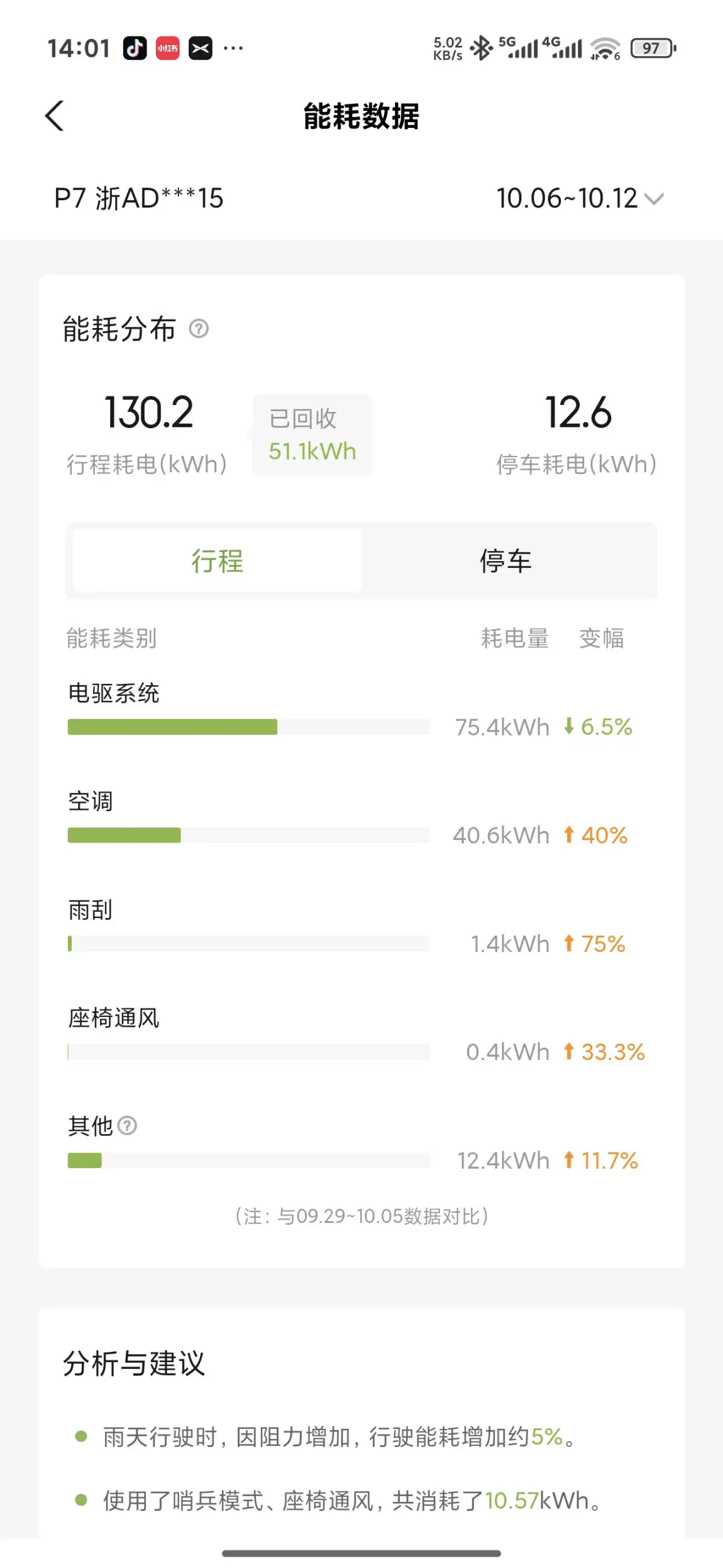 - 10.06-10.12:行程耗电130.2kWh(回收51.1kWh),电驱系统耗电75.4kWh(降6.5%),空调耗电40.6kWh(增40%),雨天阻力使能耗增5%,哨兵模式、座椅通风额外耗电10.57kWh。