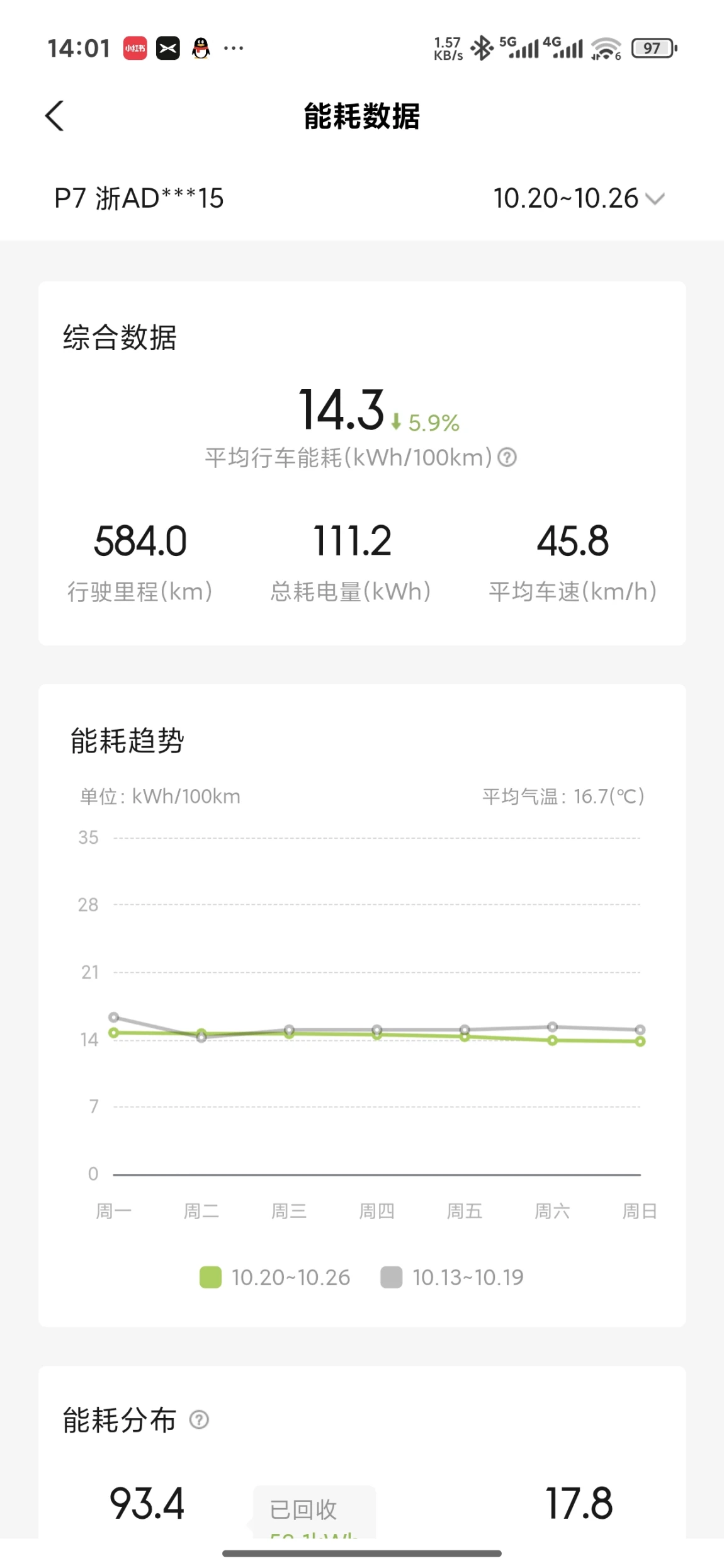 - 10.20-10.26:平均行车能耗14.3kWh/100km(降5.9%),行驶584km、总耗电111.2kWh,能耗趋势稳定,行程耗电93.4kWh。