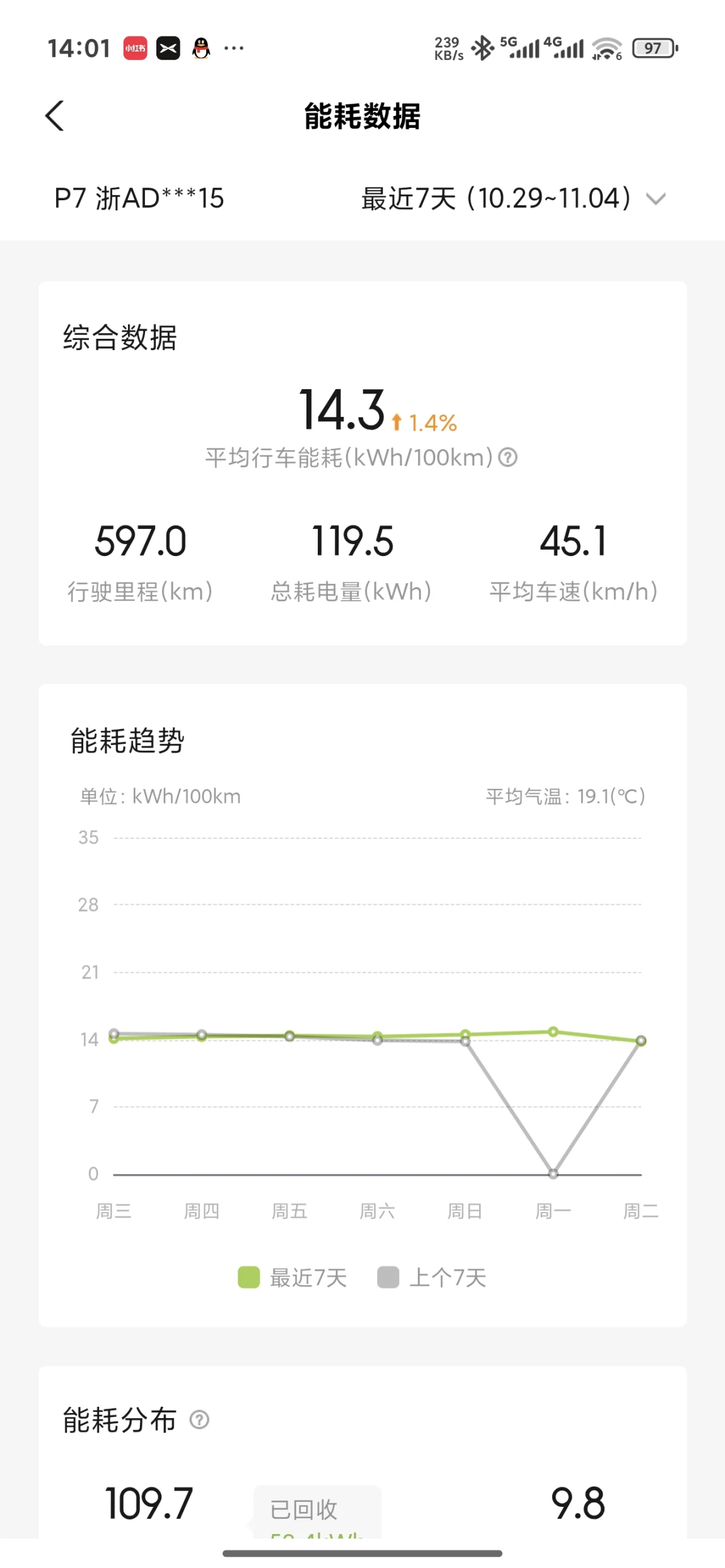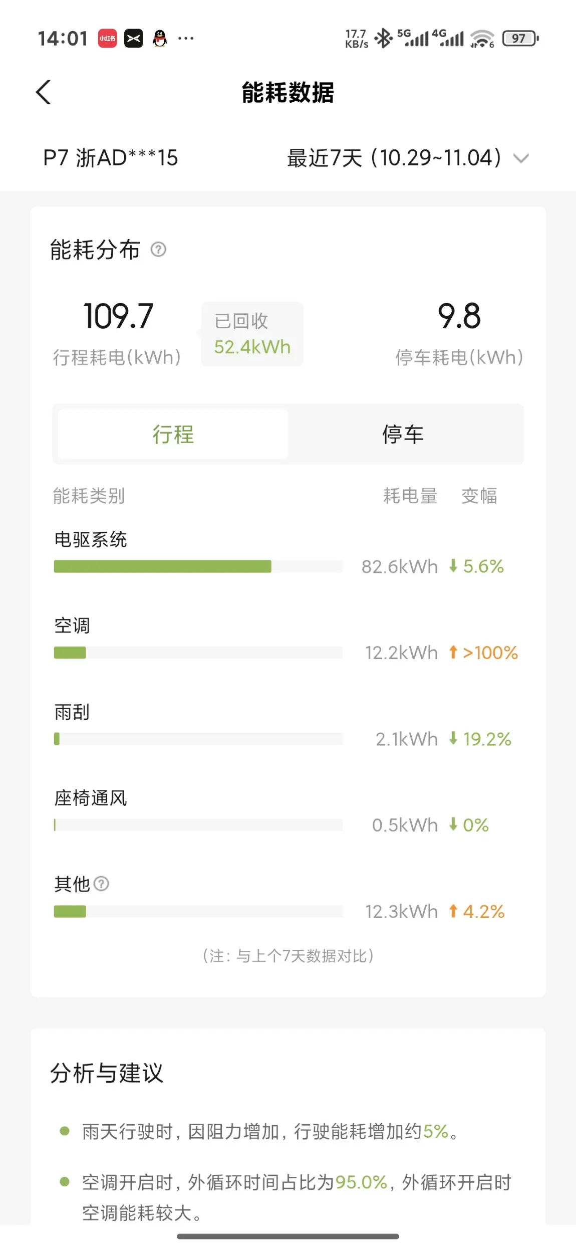 - 10.29-11.04:行程耗电109.7kWh(回收52.4kWh),电驱耗电82.6kWh(降5.6%),空调耗电12.2kWh(增超100%,因外循环占比95%),平均能耗14.3kWh/100km(微增1.4%),行驶597km、总耗电119.5kWh。