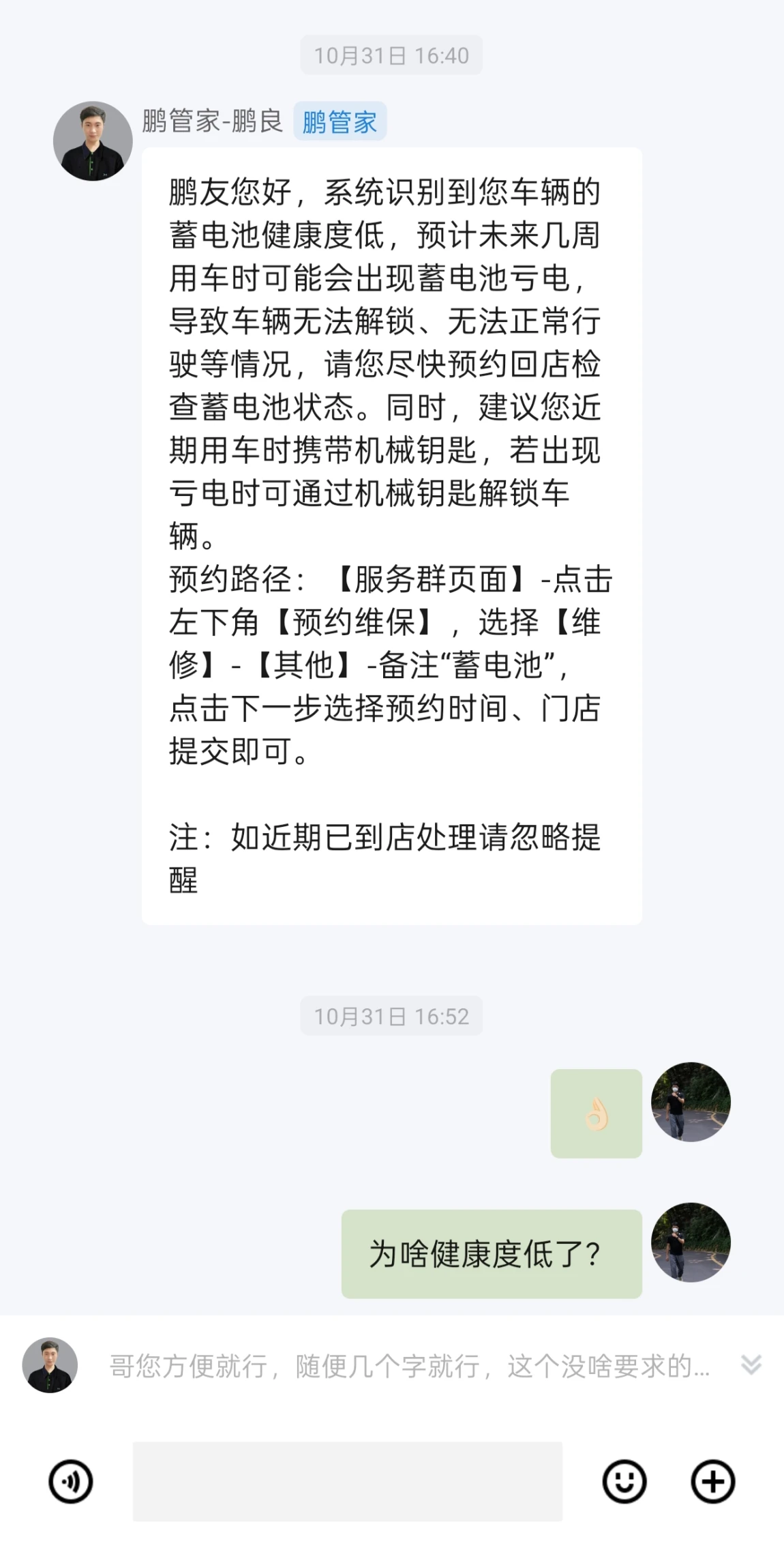 周末没号可以做检查,直接联系门店帮我沟通排队预约,检查当天蓄电池就剩11%的电量,趁着这个机会更换了蓄电池。