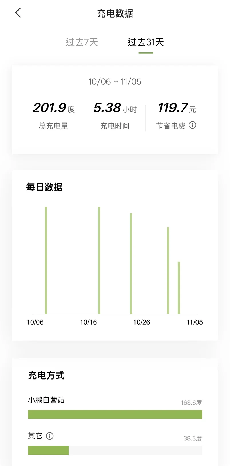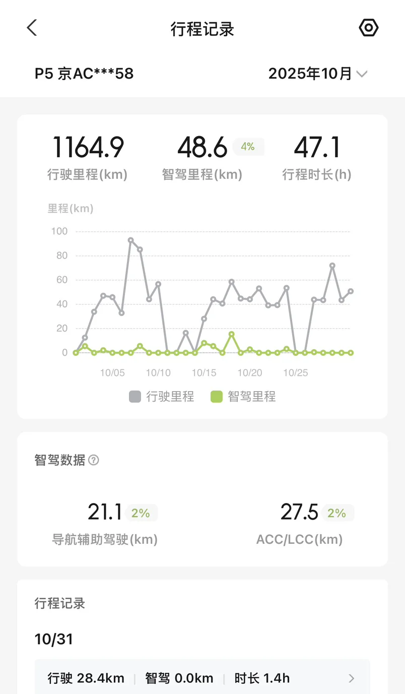 #我的10月用车总结# 10月驾着小鹏P5跑了1200公里,算完账单直接被电车的经济性圈粉!全月充电费仅120元,百公里能耗稳定在13度左右,平均每度电才1毛钱,对比油车简直省出一笔旅游基金。
