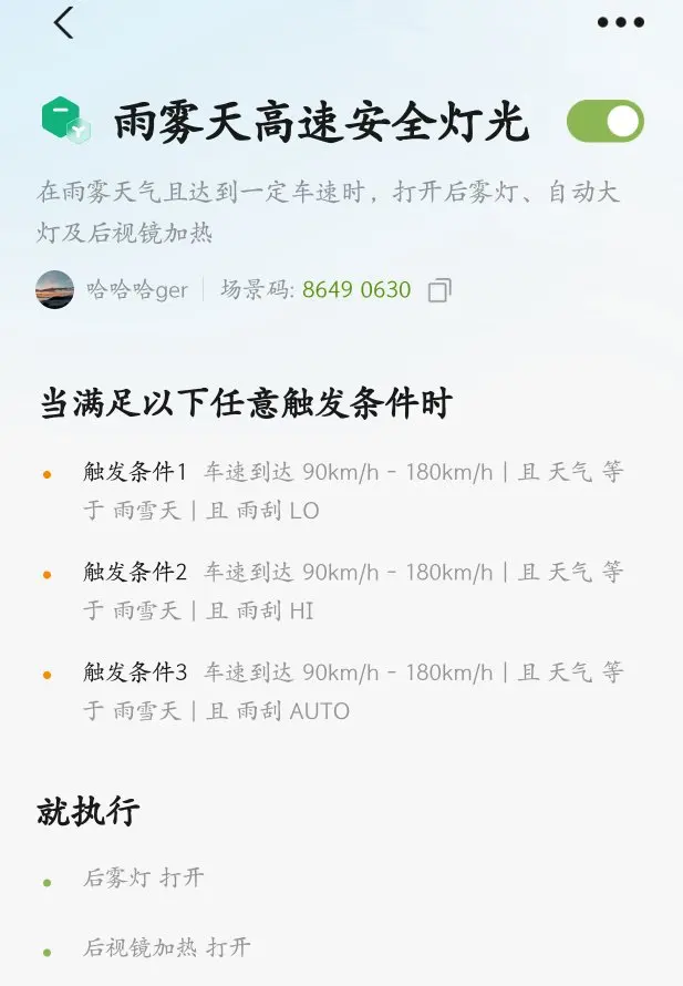6.冬天开车视线不好,尤其是下雨下雪,在跑高速的时候,可以讲图3的场景设置进去,在到达一定速度后,就自动打开后雾灯和后视镜加热,我觉得这个还是很好用的,场景码:86490630,需要的自取。