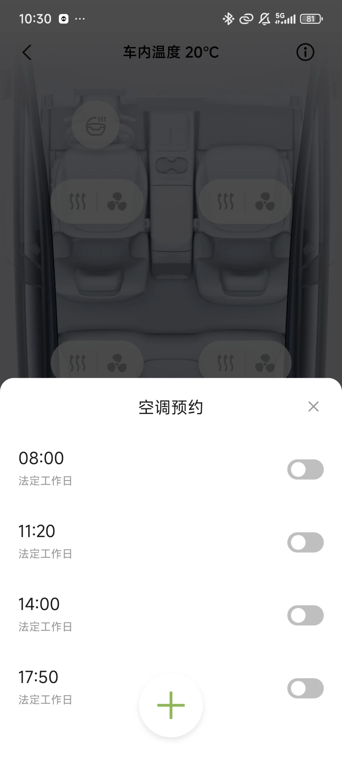 - 空调预约:上车即享暖舱:出门前在APP设定预约时间,选择26-28℃内循环,搭配“极速升温”模式,提前预热座舱,减少上车后等待时间,还比上车现开省电20%以上。