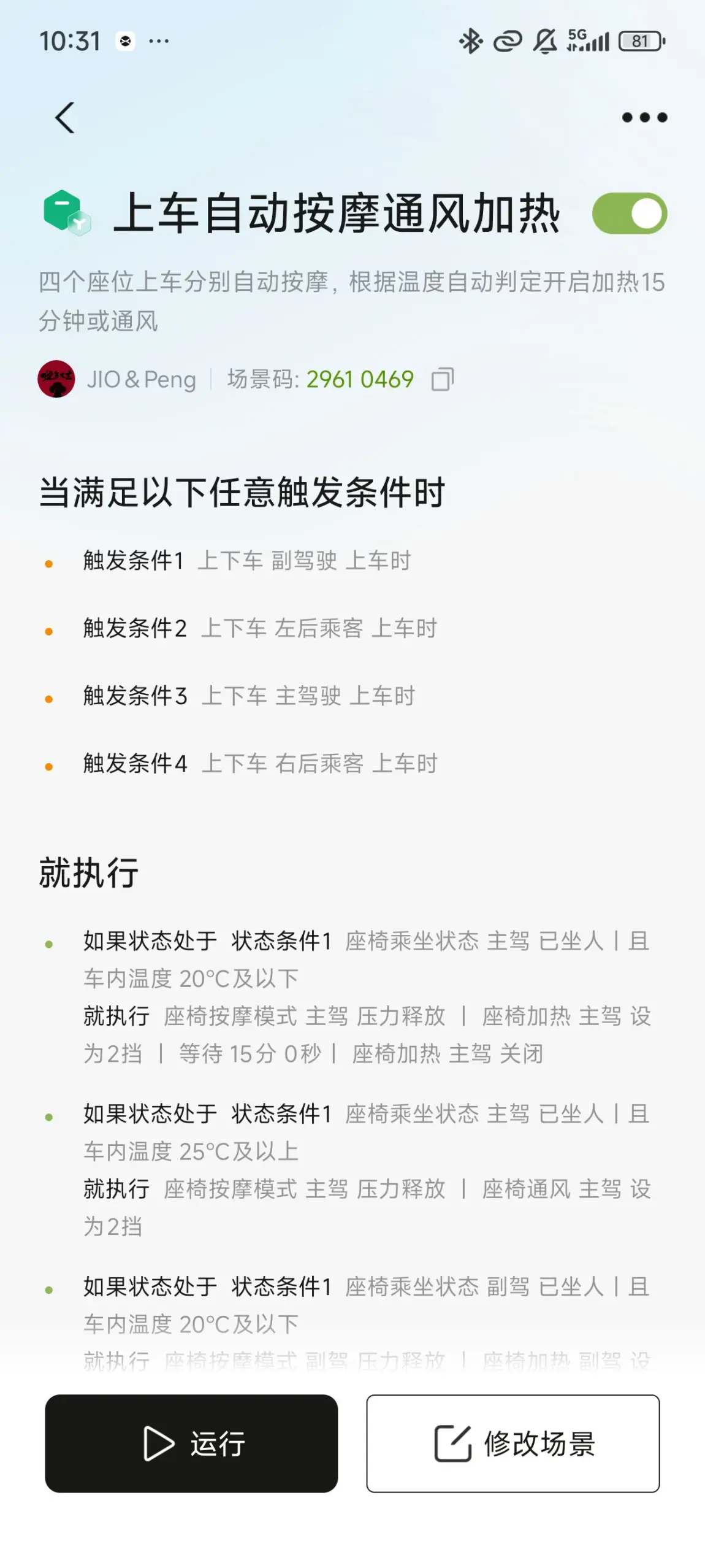 - 自动座椅加热:告别冰冷触感:在车机“智慧场景”设置触发条件,低于20℃时上车自动开启2挡加热,5分钟后可自动调档或关闭,既保暖又省电,无需手动操作更省心。