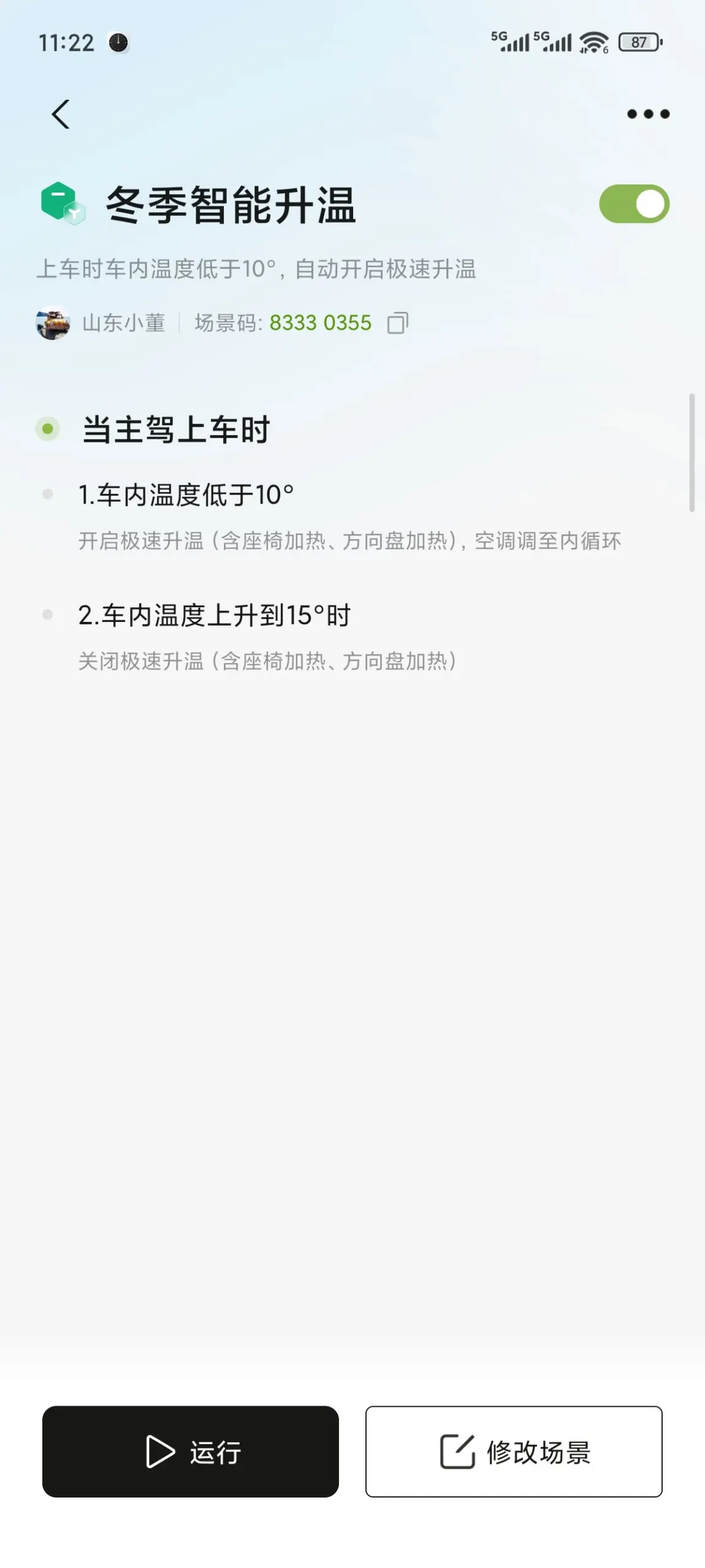 同样,在智慧场景中心搜索场景码 “83330355” 并添加。根据您的日常习惯设置好触发时间,即可享受每天“专属温暖座驾”的礼遇。