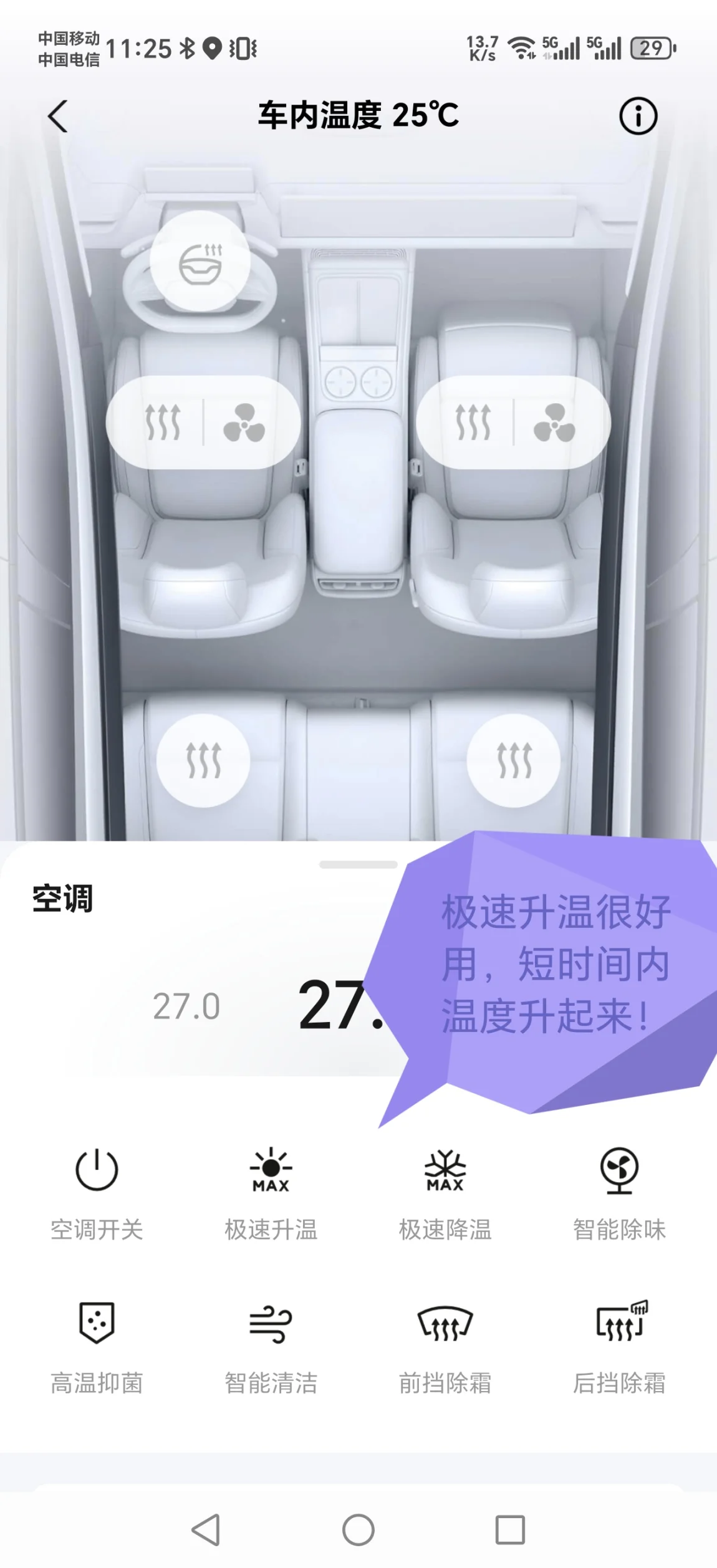 其次,如果实在赶时间要用车,可以打开极速升温,能在很短的时间内让整个车内暖和起来,而且座椅加热也自动打开了,很nice!
