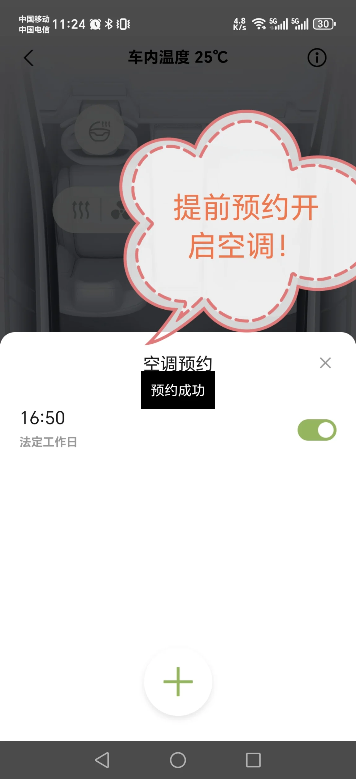 首先,可以提前打开空调,能手动控制,还能够提前预约,比如我是17点下班,就预约16.50打开空调和座椅加热,这样,下班一进入到车内就是一个很舒适的温度,再把座椅按摩一打开,一天的疲惫都消失殆尽!