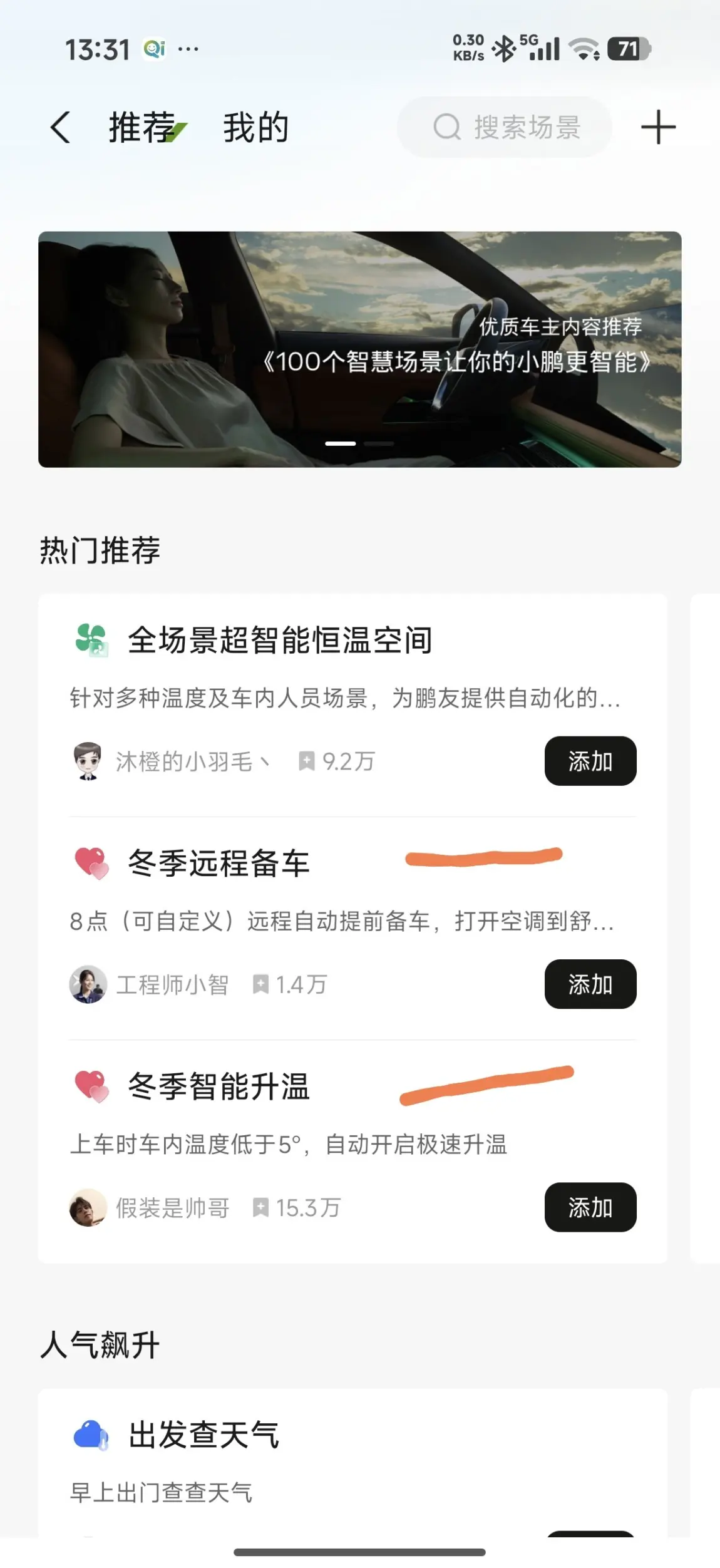 #鹏友们的冬季用车秘籍# @鹏友俱乐部 今天是立冬啦,虽然身在海南的我感受不到冬季,仍然是短袖,但是最为已经用小鹏4年的老鹏友,给广大新鹏友们分享下冬季用车秘籍。可以从车控界面找到智慧场景,添加提前备车,智能升温,能让车内提前进入舒适温度,也可以及时补充轮胎气压,冬季可以打的比标准胎压高一点,电池预热功能也可以让电池提前进入最佳工作区间,减少一定的能耗