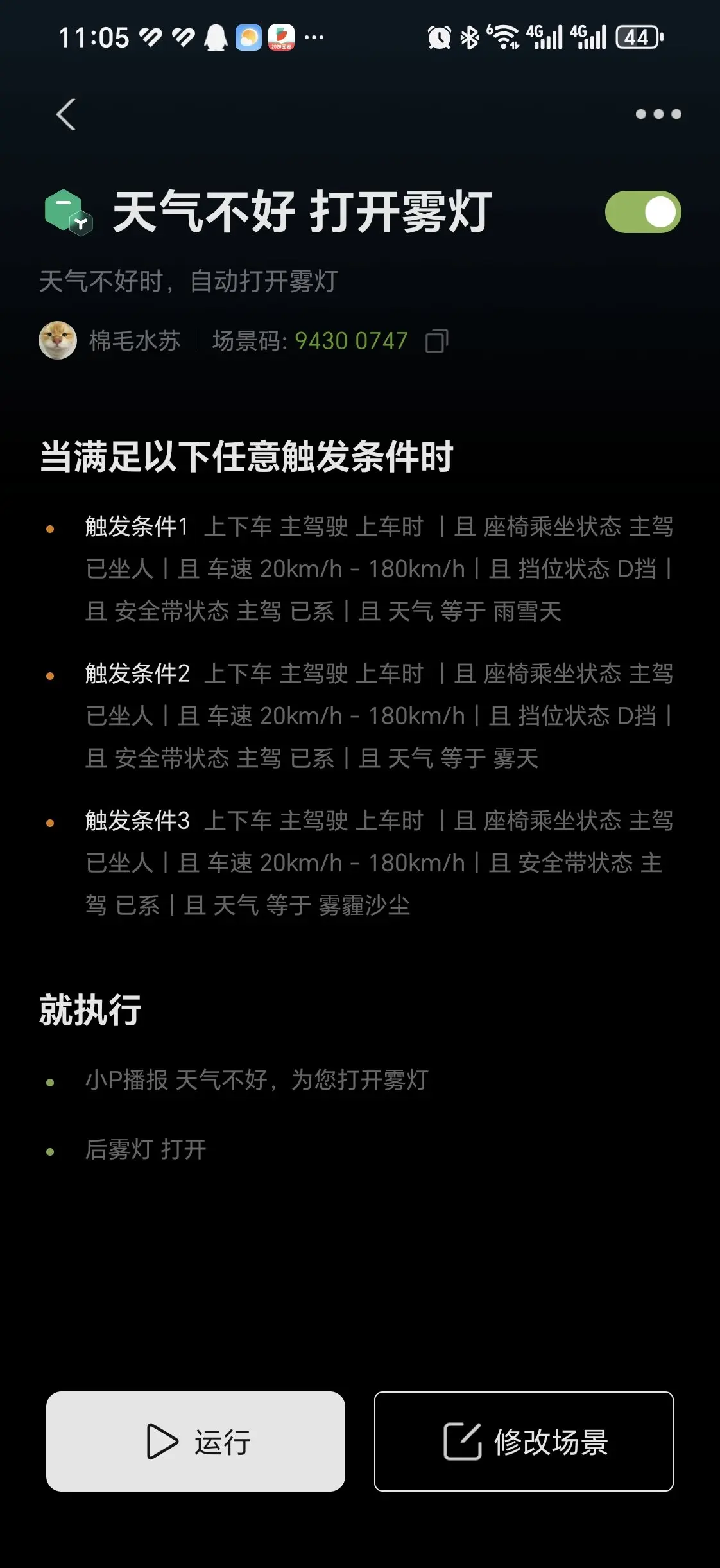 这个场景简直是我的安全感来源!它会在你上车并正常行驶后(满足车速、系安全带等条件),自动检测外界天气。如果是雨雪天、雾天或者雾霾沙尘,小P就会贴心地播报“天气不好,为您打开雾灯”,并自动开启后雾灯。再也不用在恶劣天气下手忙脚乱地找开关了,保障了后方视野,行车安全大大提升。