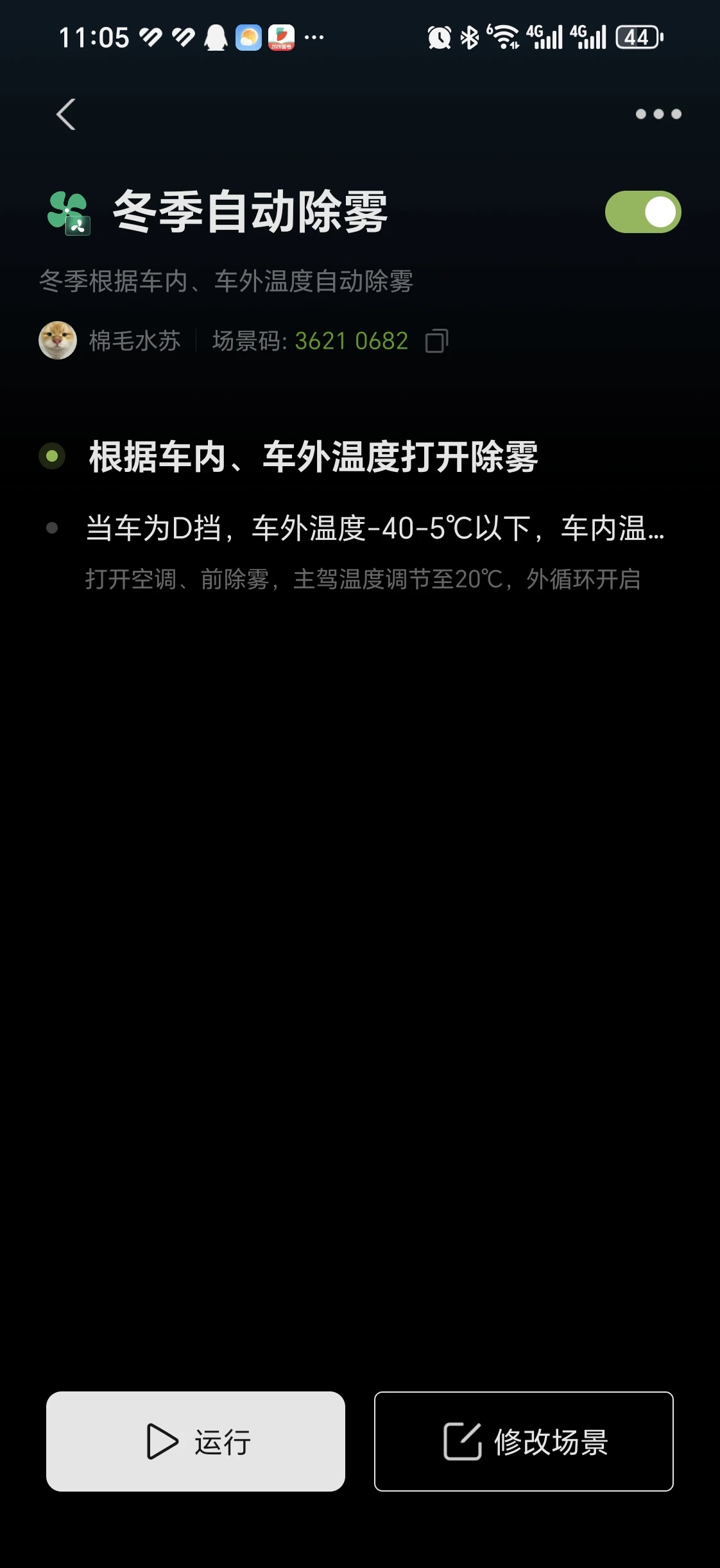 冬天最烦的就是起雾和恶劣天气视线不清,手动操作既麻烦又不安全。好在我们的车机系统足够聪明,我用“场景码”设置了两个神器,现在几乎是全程自动应对: