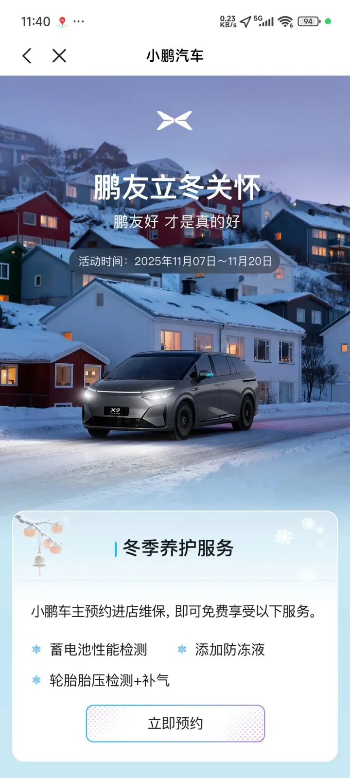 秋暮尽,立冬至,美好正当时小鹏贴心的推出了立冬的一个特别服务。适逢冬天了,胎压刚好很低,之前一直想去检测。今天看到小鹏推出了免费检测胎压的服务,正合我意。马上就去预约维保服务了。周末我就要去看看喽,感谢小彭一路以来的关怀备至。#小鹏#鹏友立冬关怀