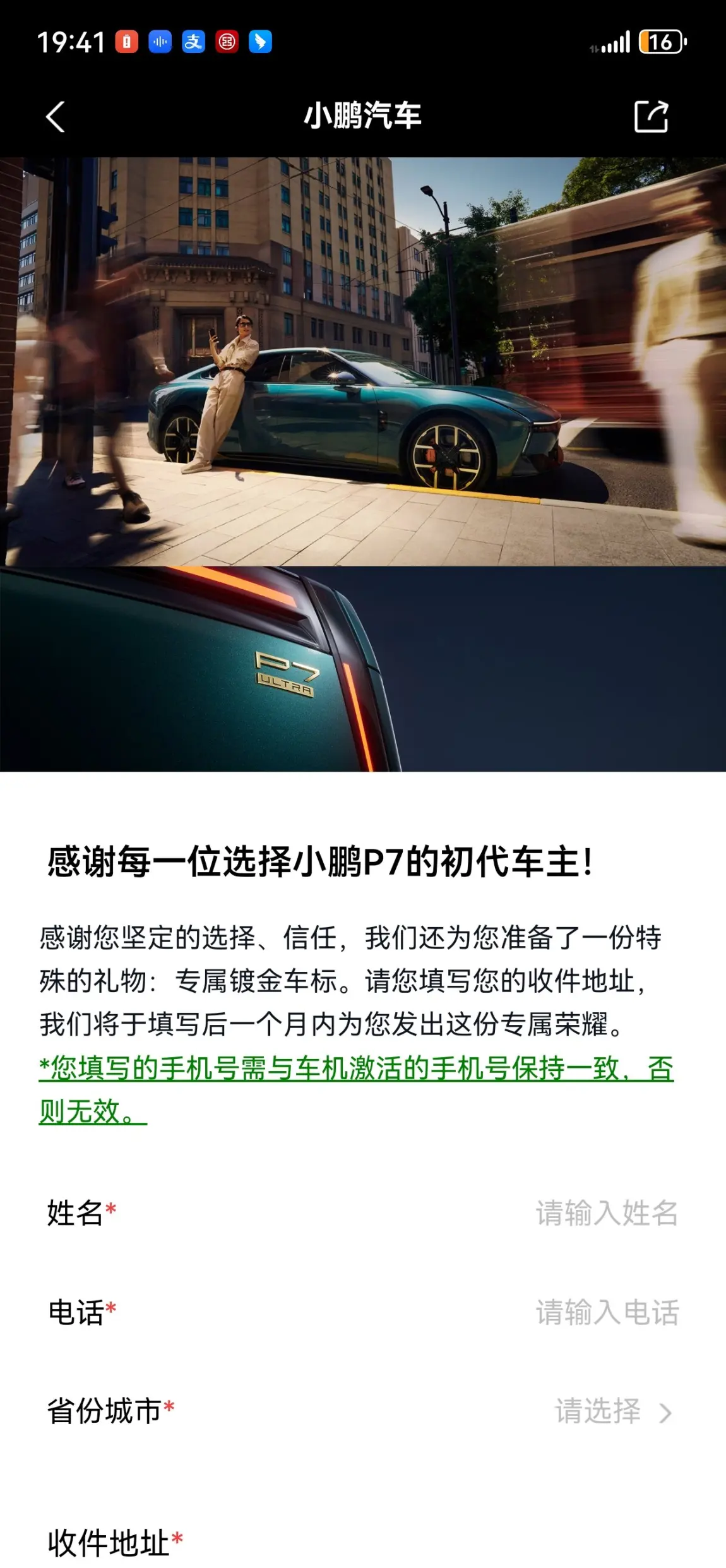 我的P7镀金车标来啦!小鹏总发布会上说老车主多送一个镀金车标,没有文字说明,只是口头说明,之前提车的时候问交付跟售后那边,都说不太清楚是以什么形式赠送,现在提车三个月多了,晚上七点突然收到这个消息,真的有点惊喜的,期待上车的效果(图片上是浩瀚绿车色颜色的样子,不知道我的星芒蓝车身颜色贴上去会怎么样)。
