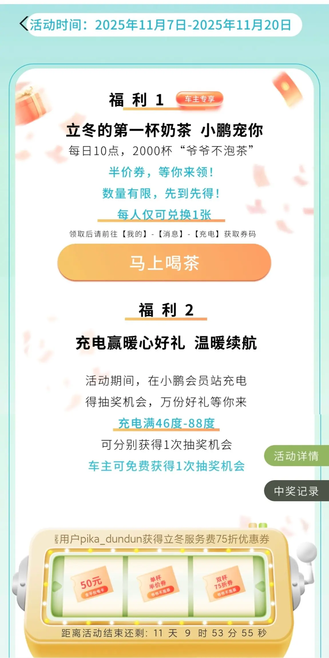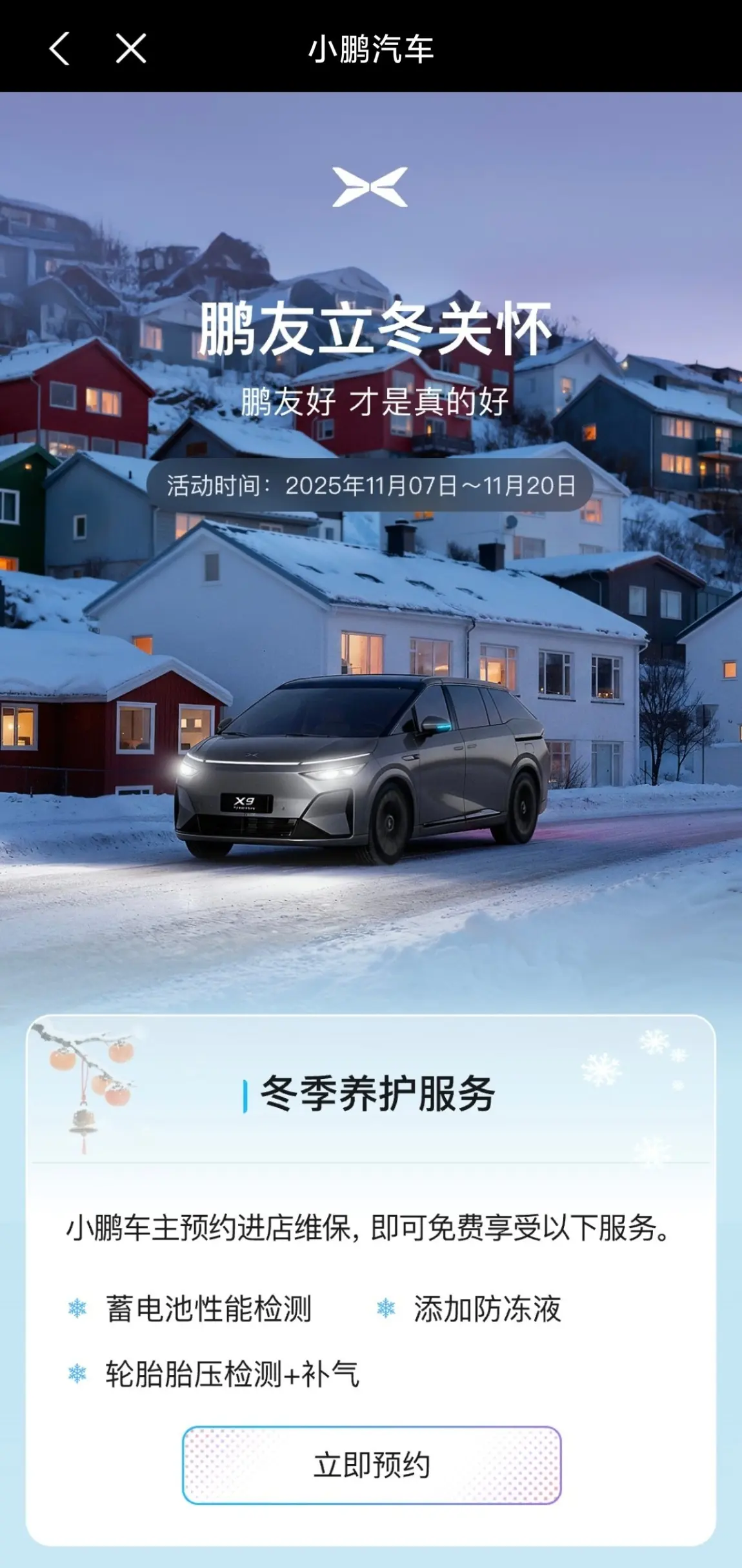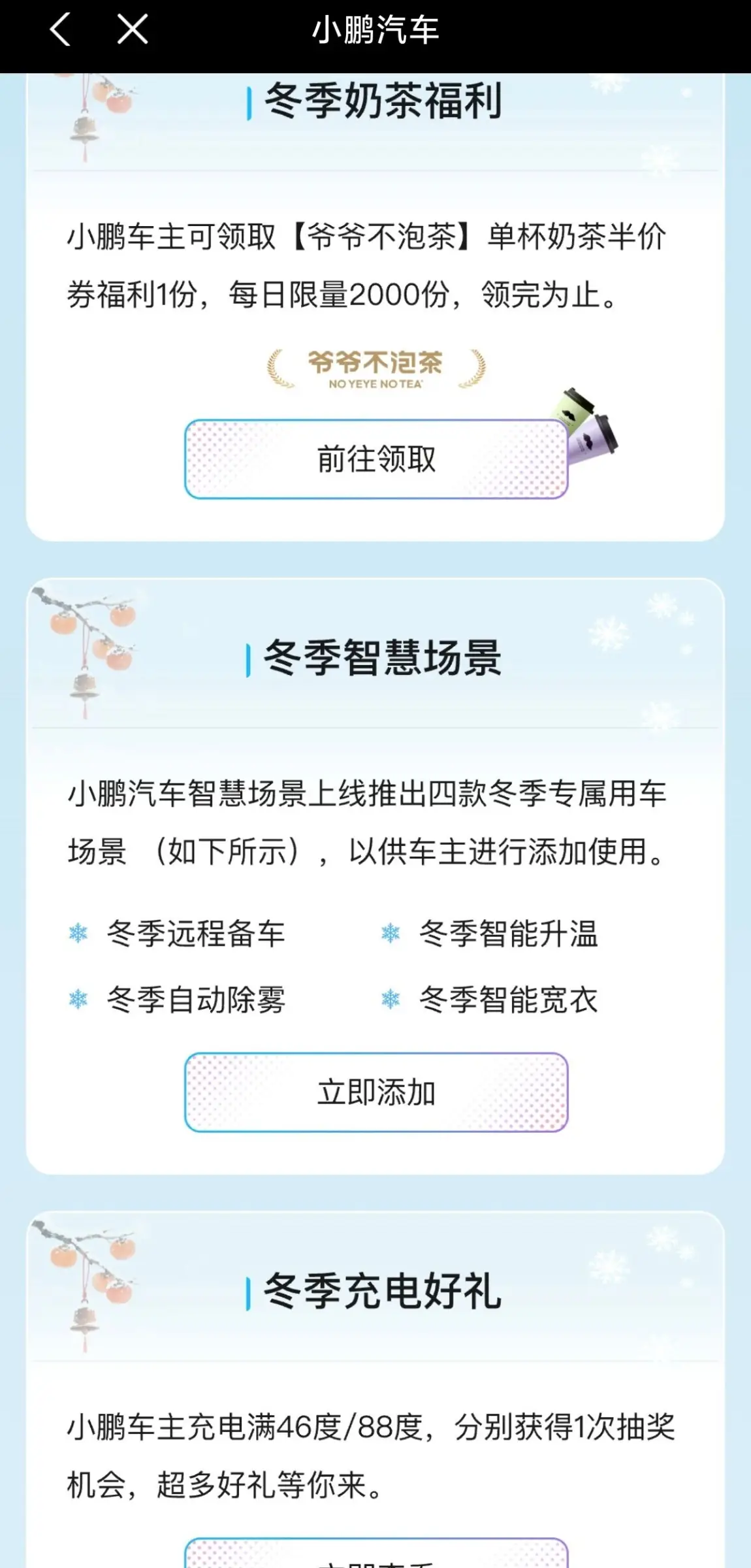 冬季降临,早起通勤的刺骨寒意、方向盘冻手的窘迫、续航打折的焦虑,上车不用等,温暖先到位。提前APP设置智慧场景,出门一旦触发条件自动开启座椅加热、方向盘加热、空调自动22度,上车即暖无需手动调节目前为止续航不打折,冬季续航变化微小。而且可以提前谷电预约充电,出门前提前预热电池,来保护电池使用寿命小鹏立冬关怀,还有鹏友的第一杯奶茶。这个冬天,让小鹏的智能与贴心,成为你抵御寒风的铠甲