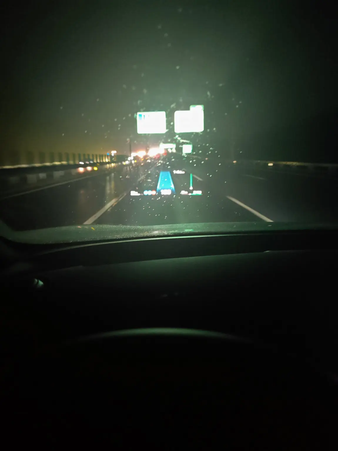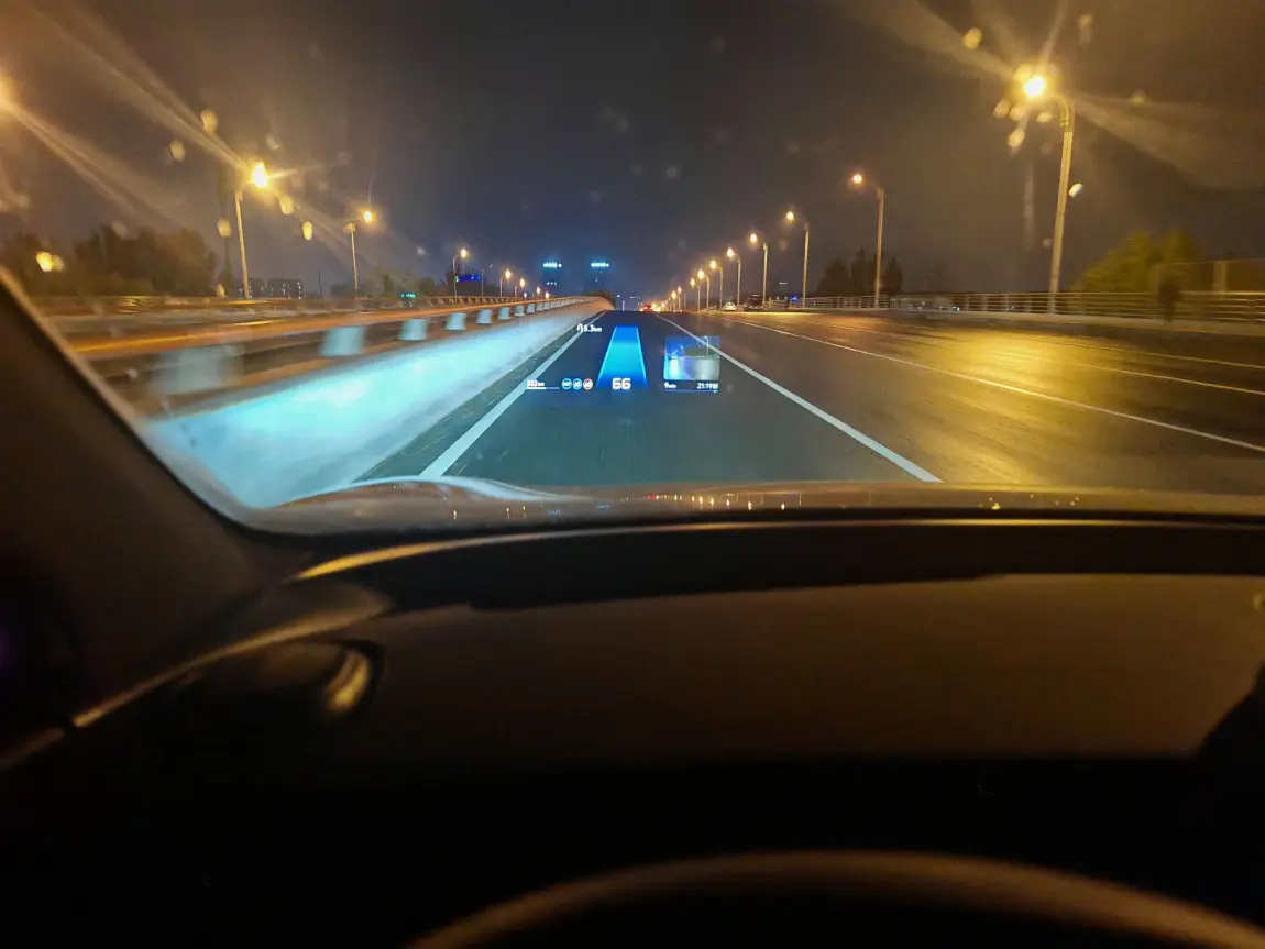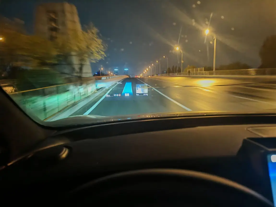 看一下这几张图,这正是当时的情景: 雨滴在挡风玻璃上滑落,而清晰的AR-HUD将车速、导航信息投射在前方,让我无需低头,视线始终聚焦路面,安全感十足。