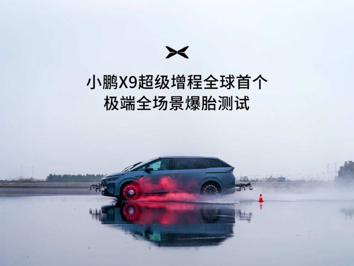 小鹏X9超级增程「全球首个极端全场景爆胎测试」通关成功!在模拟7人满载状态下在积水路面、暴雨天气、同侧双轮、模拟冰面、高速绕圆五大场景下,高速行驶中爆胎瞬间依然仍能保持稳定行驶!