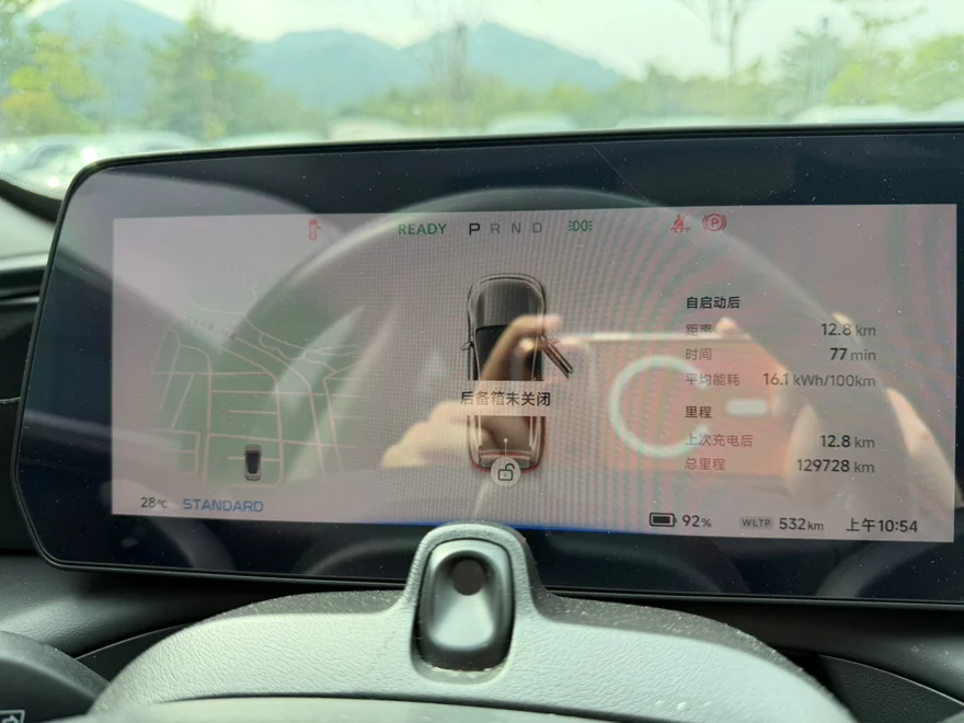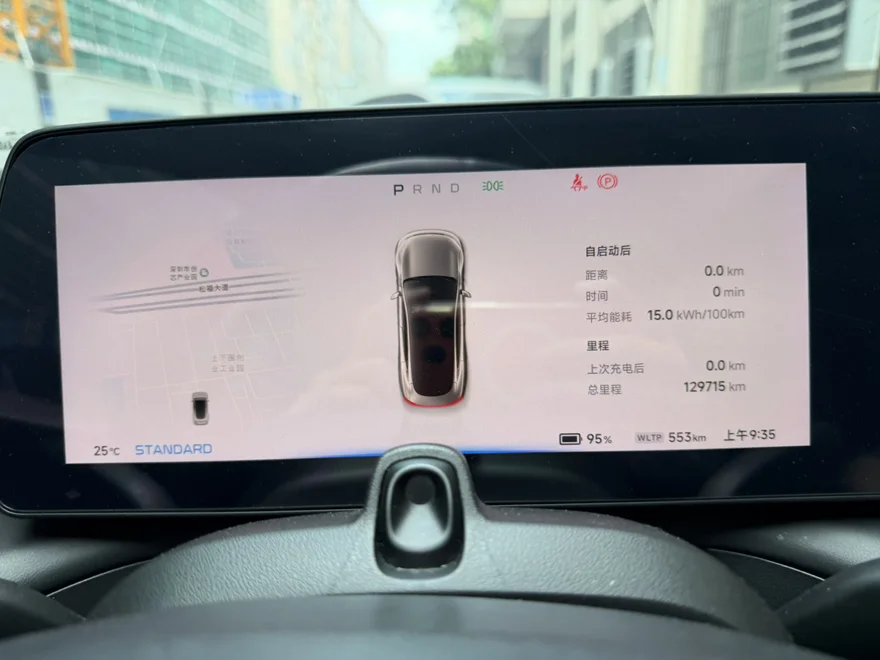 周日早上吃完早餐,9点35分开始出发,进到P7内看到,P7的WLTP电量剩余553公里。车外温度25度,所以空调还是要打开的。驾驶模式设置成标准模式,能量回收设置成低。同时打开了自己喜欢的音乐,开启“秋天第一爬”的启程。