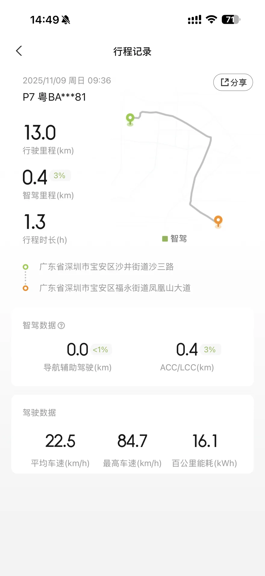 从行程记录看,即使最高速度有84.7km/h,但是因为塞车,所以平均速度只有22.5km/h,这段路程能耗是16.1kWh/100km。