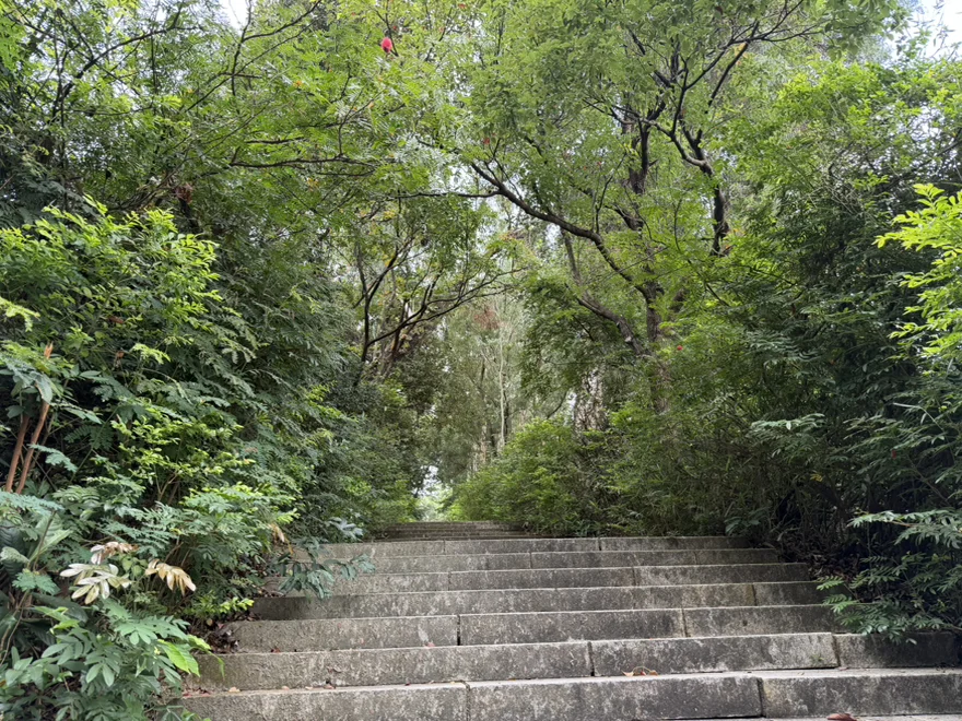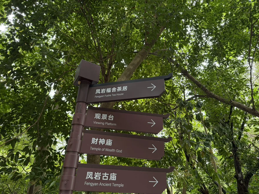 到海拔678米的凤岩古庙途中山路不难走,沿途全是绿化带。脚下是平整的路和阶梯,身边是密密的草木,呼吸着新鲜空气,一周的繁忙慢慢散了。