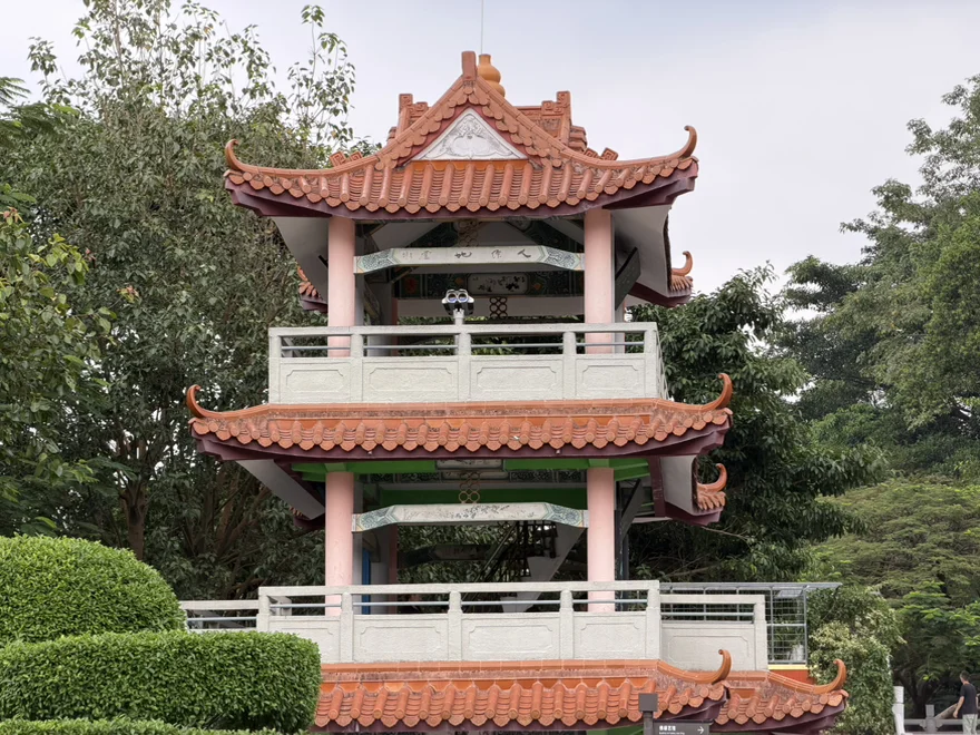 沿途路上有不少凉亭和石头板凳,累了就坐下歇脚。站在凉亭里,能望见深圳的一角,密密麻麻的楼房和山间景区对着望,反差很明显。