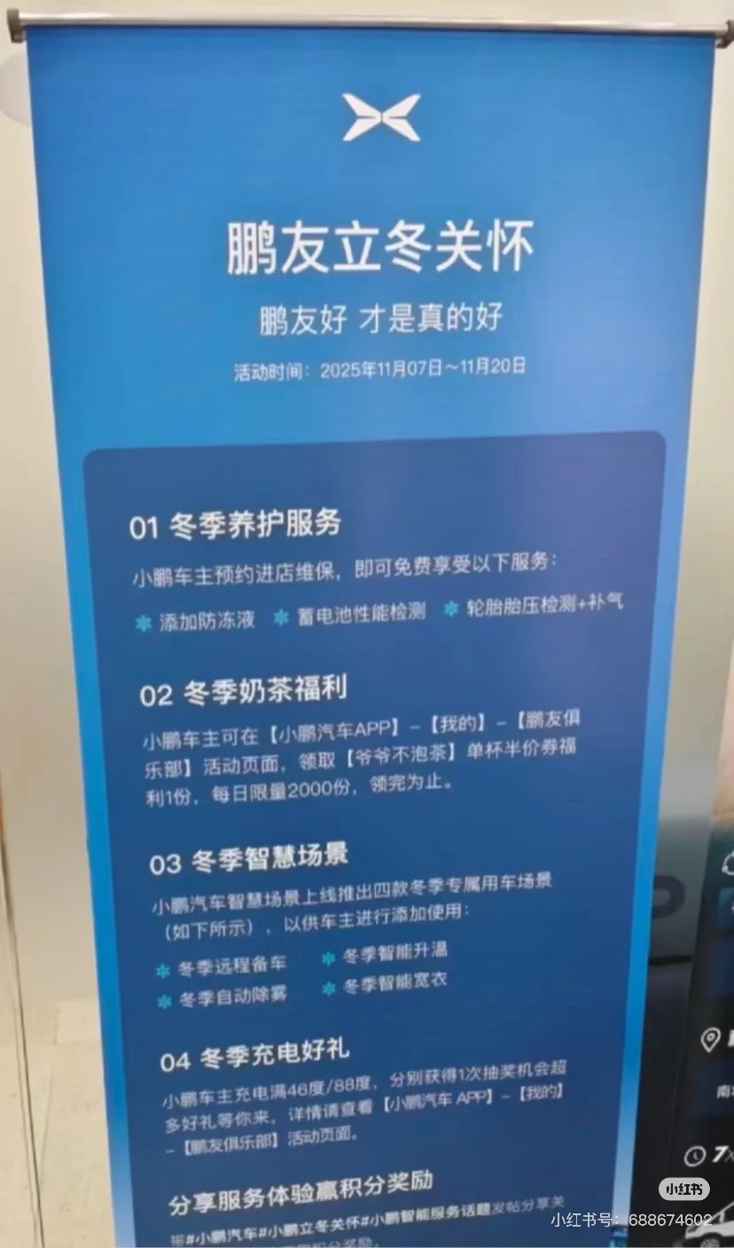 #小鹏汽车# #小鹏立冬关怀# #小鹏智能服务# ✅养护服务预约啦,检车后又洗了车✅爷爷不泡茶的券也领取啦,马上去用起来✅冬日专属智慧场景真的好有氛围感呀,推荐大家都去设置自己喜爱的场景,提前设置保持车内温暖,情绪价值具像化哦,✅去专属充电站,冬日满电出发✌️奔向融融的阳光