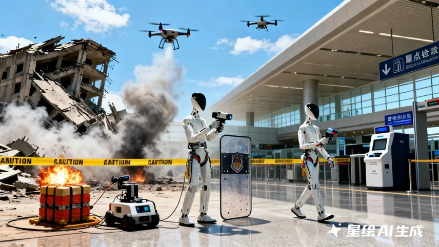 #小鹏Iron在身边# 小鹏Iron警用机器人应用展望,在公安工作中,为保障公共安全、提升执法效能,诸多场景需在高危环境下开展作业,特别是防爆排险、涉险区域排查、重大活动安保等任务,即便配备专业防护装备,仍面临较高安全风险。在高危岗位中替代民警发挥关键作用。【以下图片由AI生成】