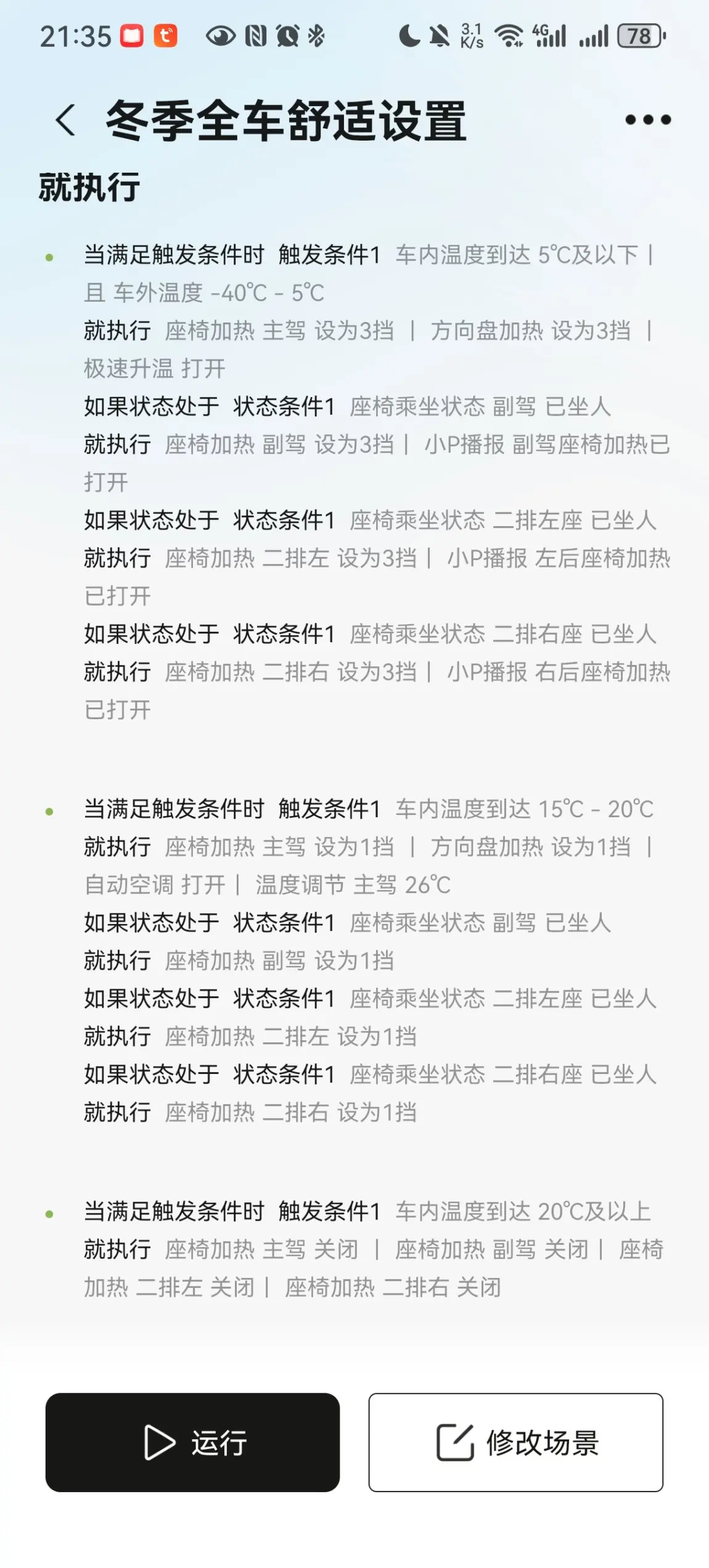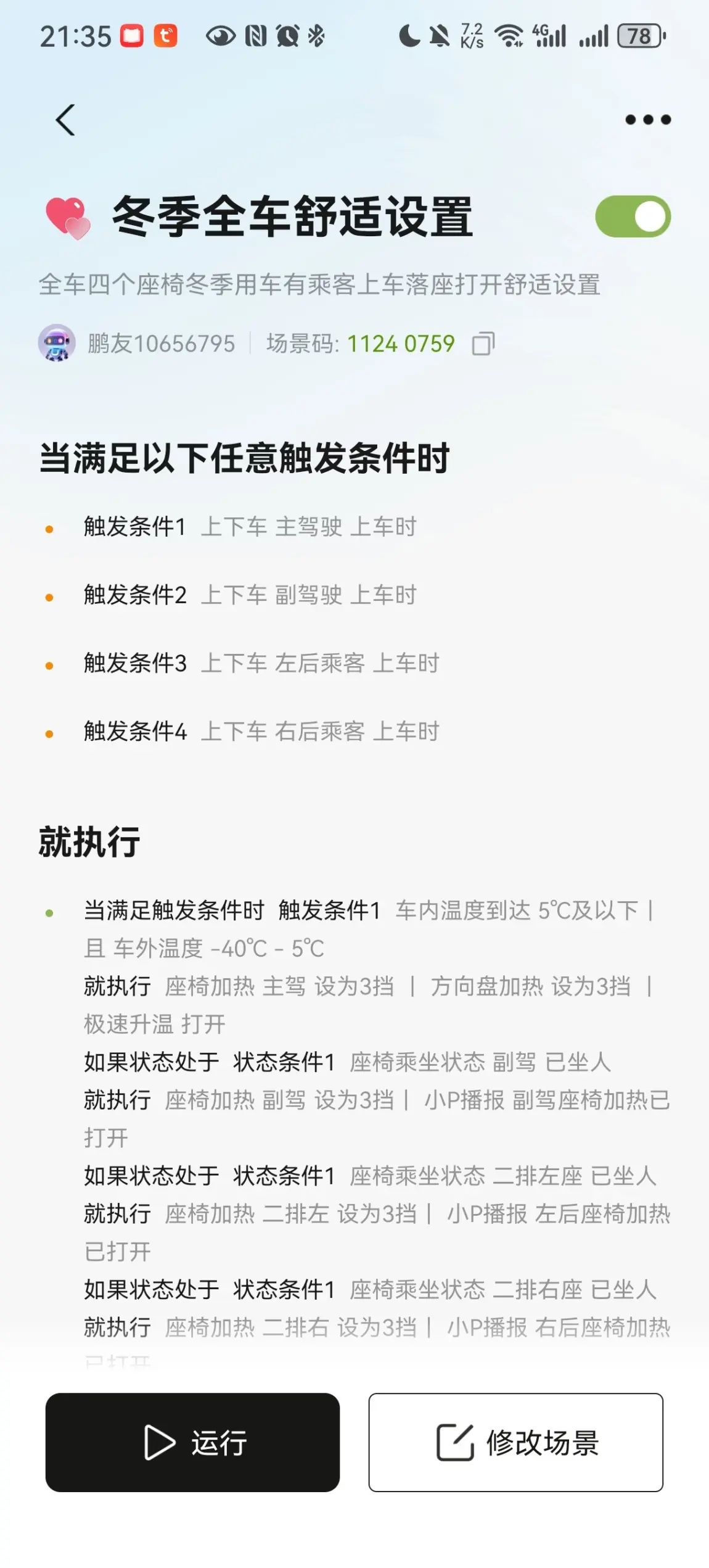 #鹏友们的冬季用车秘籍# 为了冬季用车方便快捷舒适,自己慢慢琢磨了一个智慧场景,上下车自动设置空调,自动打开座椅加热,随着温度自动调节空调设置座椅加热设置,直到最后关闭座椅加热,因为目前所在地温度还不是很低,因目前所在地温度还不是很低,还正在试用中,欢迎大家提出修改意见,场景码:11240759;进入小鹏App,智慧场景搜索即可查看。