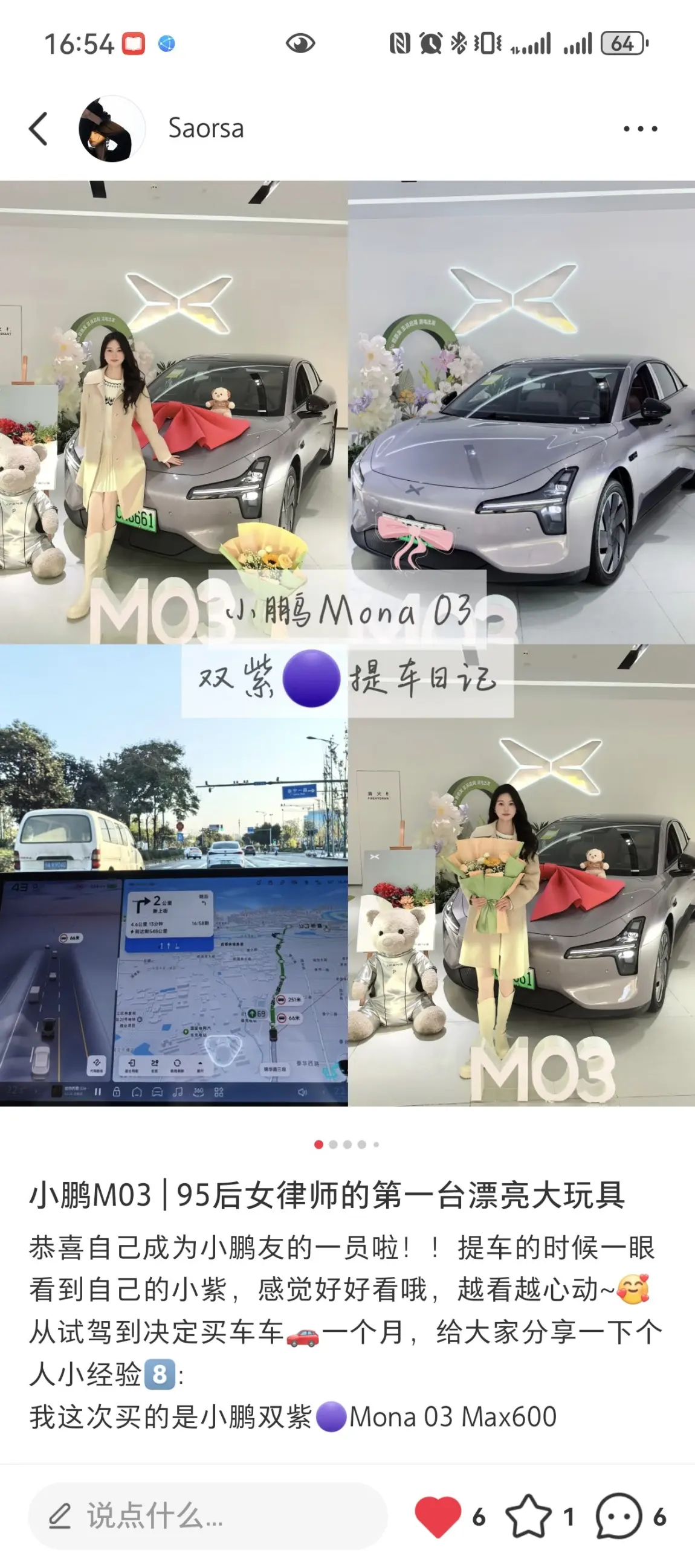 首先,建议uu们订车前多试驾呀,因为我个人比较偏向有智驾的(想有自动泊车功能)。所以我当时除了小鹏还试驾了问界m5和智界R7,感觉都还可以,但是外观真的还是比小鹏差很多,而且性价比也不是特别高。因为现阶段偏向于代步,最后对比价格、智驾、外观颜色、性能最终决定了mona m03😊~10.28号下定锁单,刚好赶上月底活动送了3.5万的积分,可以去兑换仪表盘然后抵扣大部分的充电桩费用,最终加上保险落地价是差不多14w左右😁