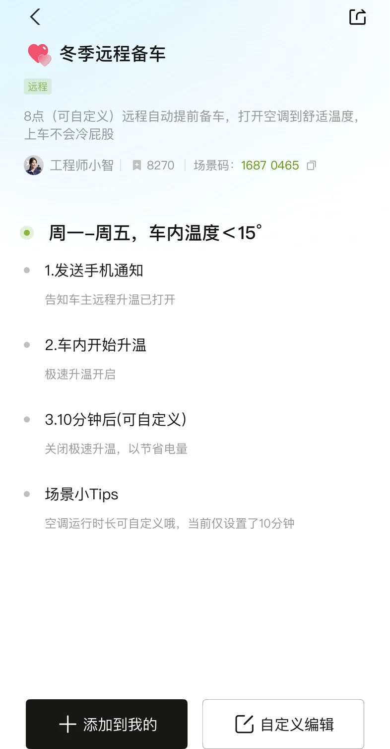 智慧场景功能,简直是为南方湿冷天量身定制的“神器”。我自定义的两个场景用了就再也离不开。“晨间通勤模式”设定每天7点20分自动触发,此时电池会提前预热到最佳工作温度,空调自动切换为内循环24℃,主驾座椅和方向盘加热调到2档。我洗漱完下楼,拉开车门就是一股暖意,座椅和方向盘没有丝毫冰凉感,再也不用哆哆嗦嗦等升温。另一个“雨天除雾模式”更贴心,只要说“你好小鹏,雨天开车”,系统会立刻关闭AC、开启前风挡除雾,同时自动降低车窗1厘米平衡内外温差,几秒钟就能驱散玻璃上的雾气,雨天行车安全感直接拉满。