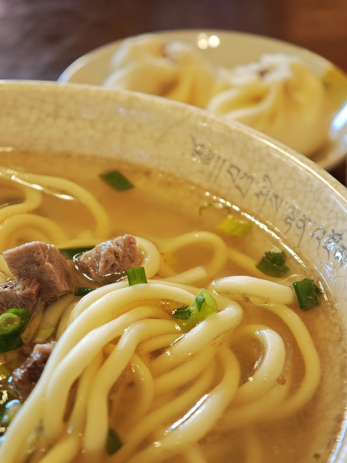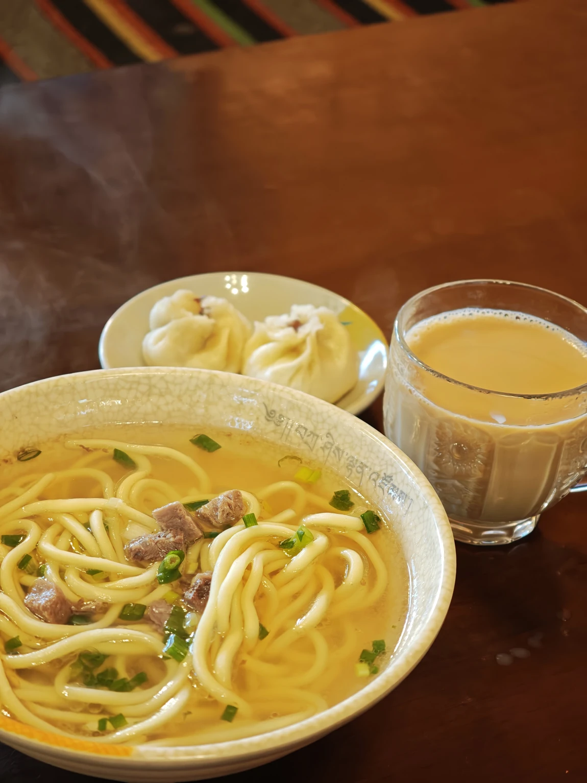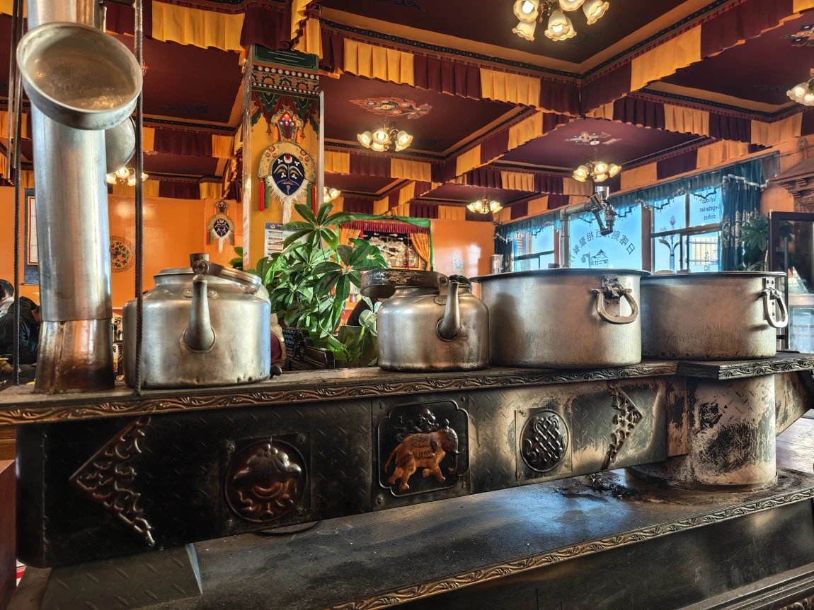 来了藏区以后,每天吃什么是件头疼的事,但是早餐我最喜欢的还是藏族的牛肉面和甜茶。这里的牛肉面跟杭州、兰州的不太一样:是用牛骨熬出汤底,然后煮一把非常粗的面条,最后切一点牛肉粒进去。虽然看起来量很小,但是却挺管饱的(也有可能是我胃口小了)。除了牛肉面,还有这里的甜茶也值得推荐,正宗的西藏甜茶是用牛奶和茶叶一起煮出来的,口味比较像我们平时喝的奶茶,但是这里的更香甜一些。每天出发前我都会打上一壶在路上慢慢喝,听说还能缓解高反的症状。