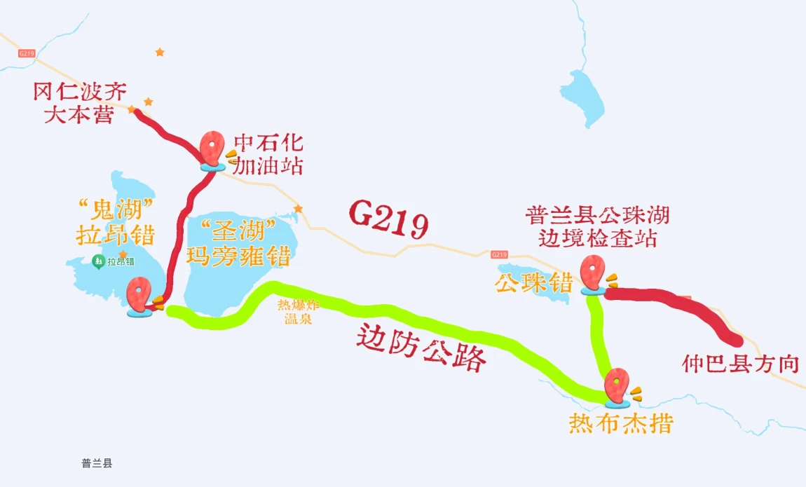 走这个路线的好处是不用走回头路,另外就是这条路线的风景也是绝美,除了玛旁雍错南岸可以直接下到湖边,另外路上还有“热爆炸温泉”(没错,就叫热爆炸)、白沙河谷、热布杰措等景观。