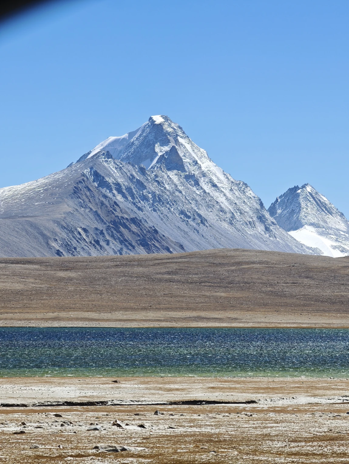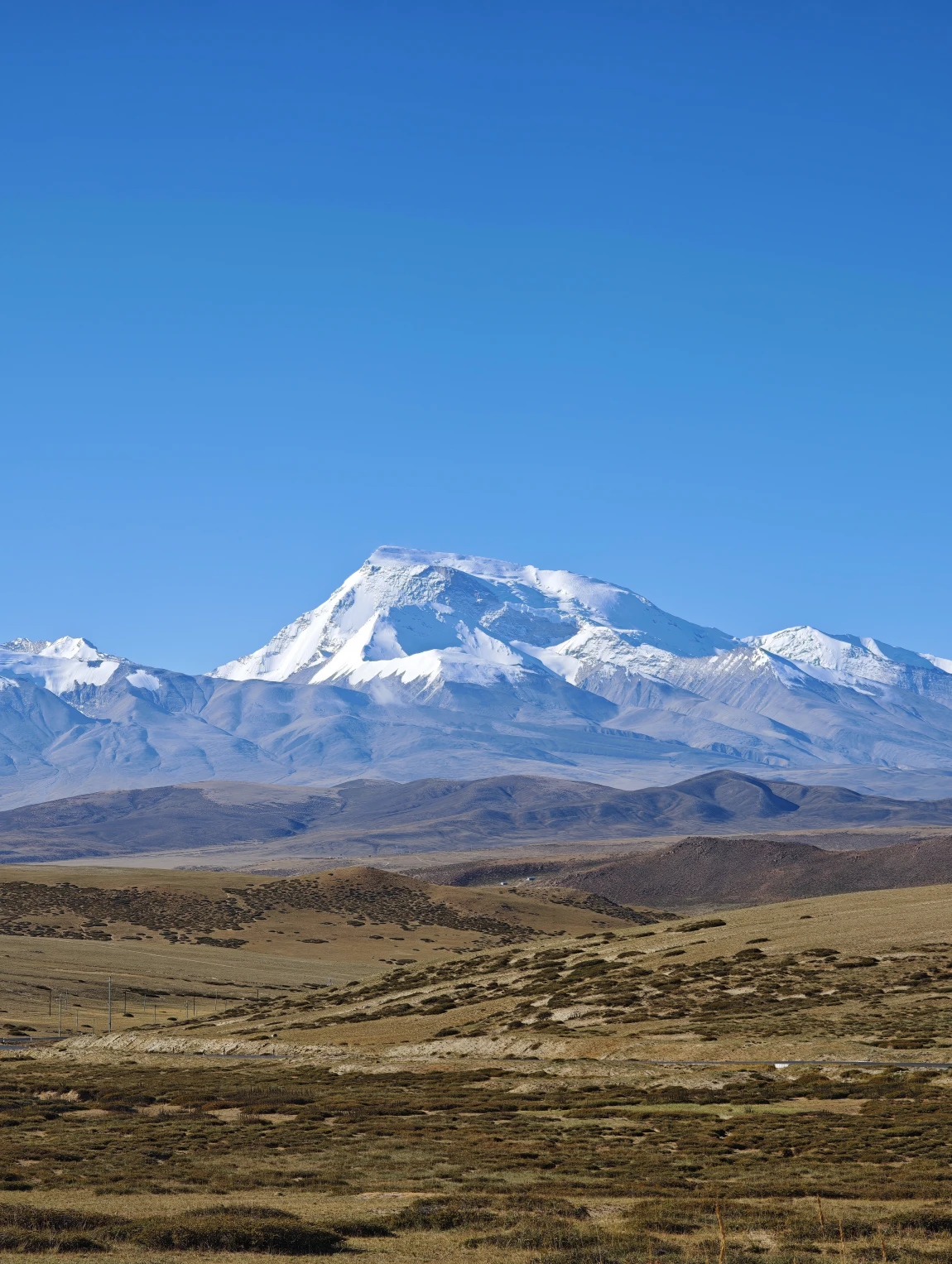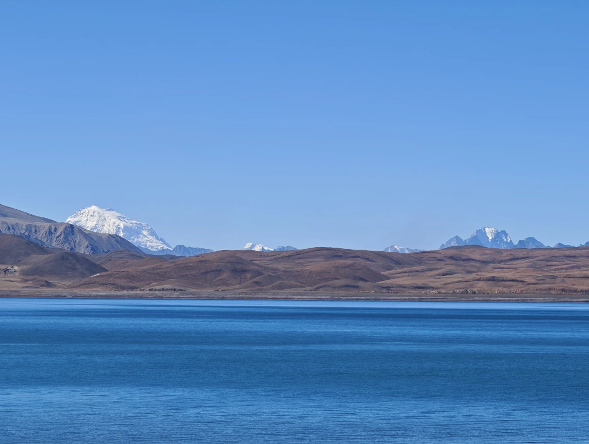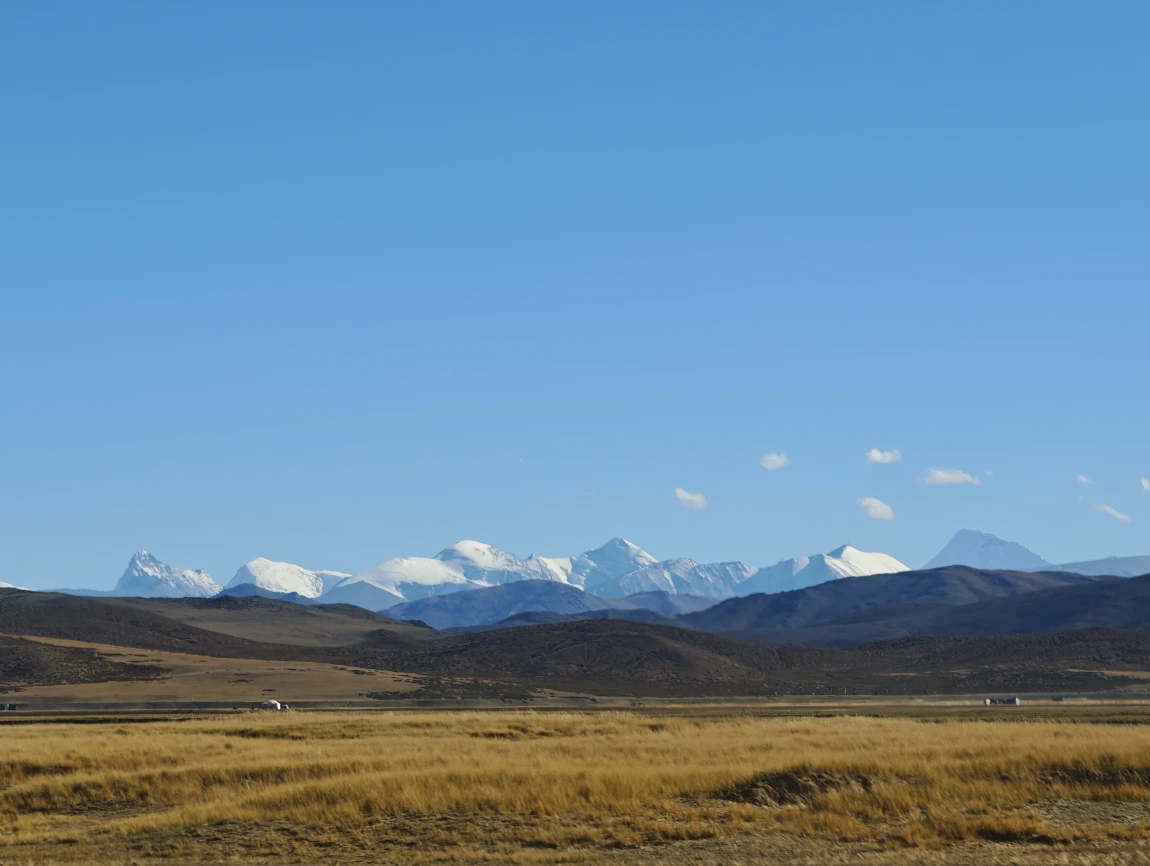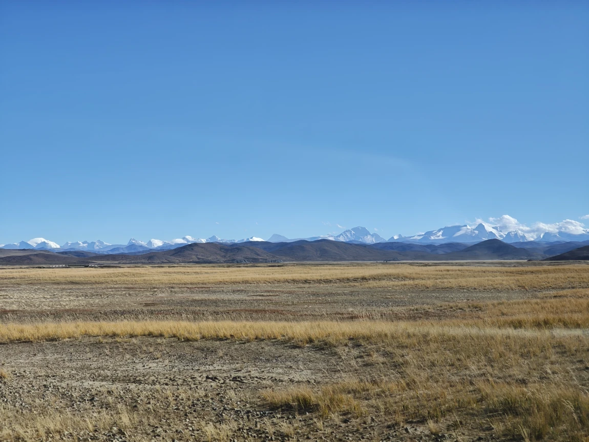 从边防公路绕出来是公珠错边境检查站,从这里右转向东就回到了219国道上了,前面会翻越一个5211的垭口,下去之后就一路平坦了。前往仲巴县的路上,远处可以看到一排雪山,这些雪山就是喜马拉雅山脉,有不少雪山都是在尼泊尔的境内,虽然看过去不高,但其实个个都是六七千米级的雪山,没有做功课,不知道他们都叫什么名字,其中有一座尖尖的像金字塔一样的雪山,应该就是国王峰吧。