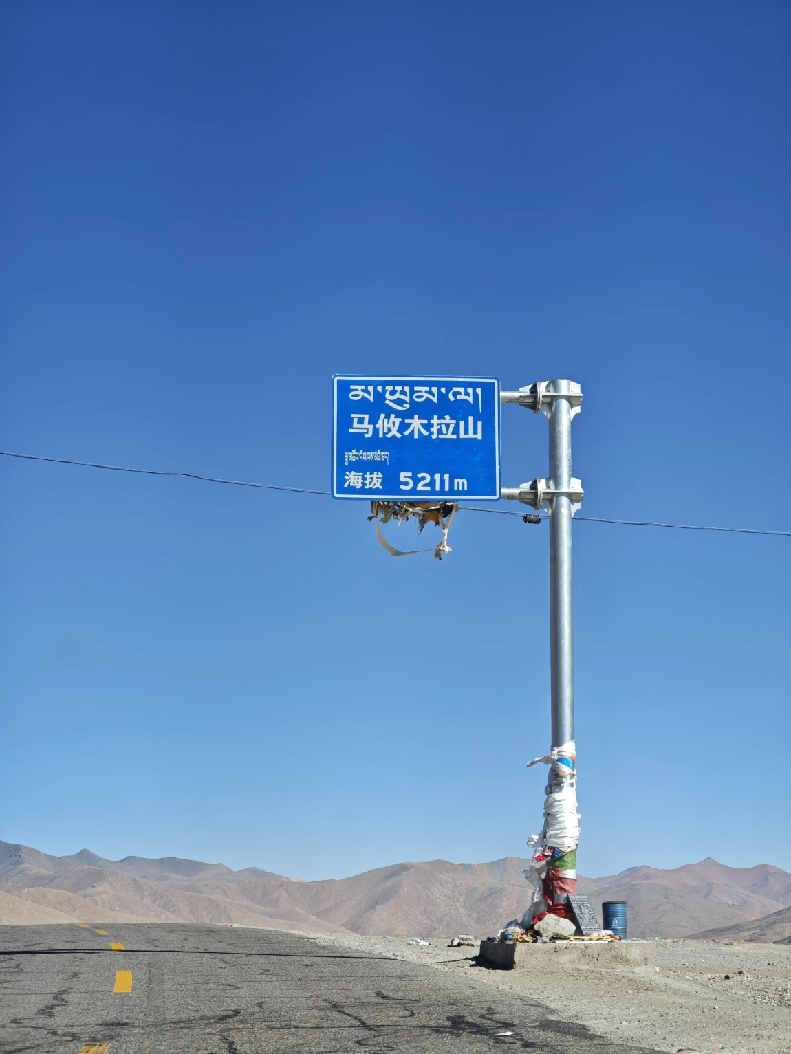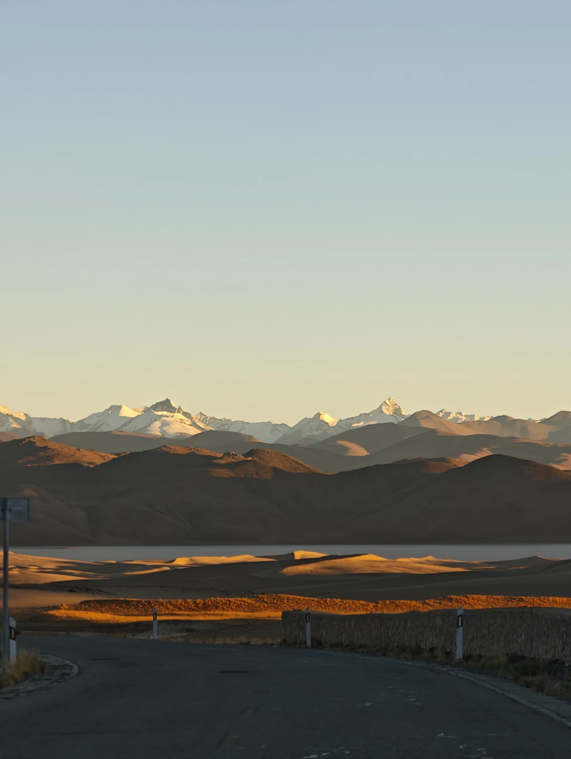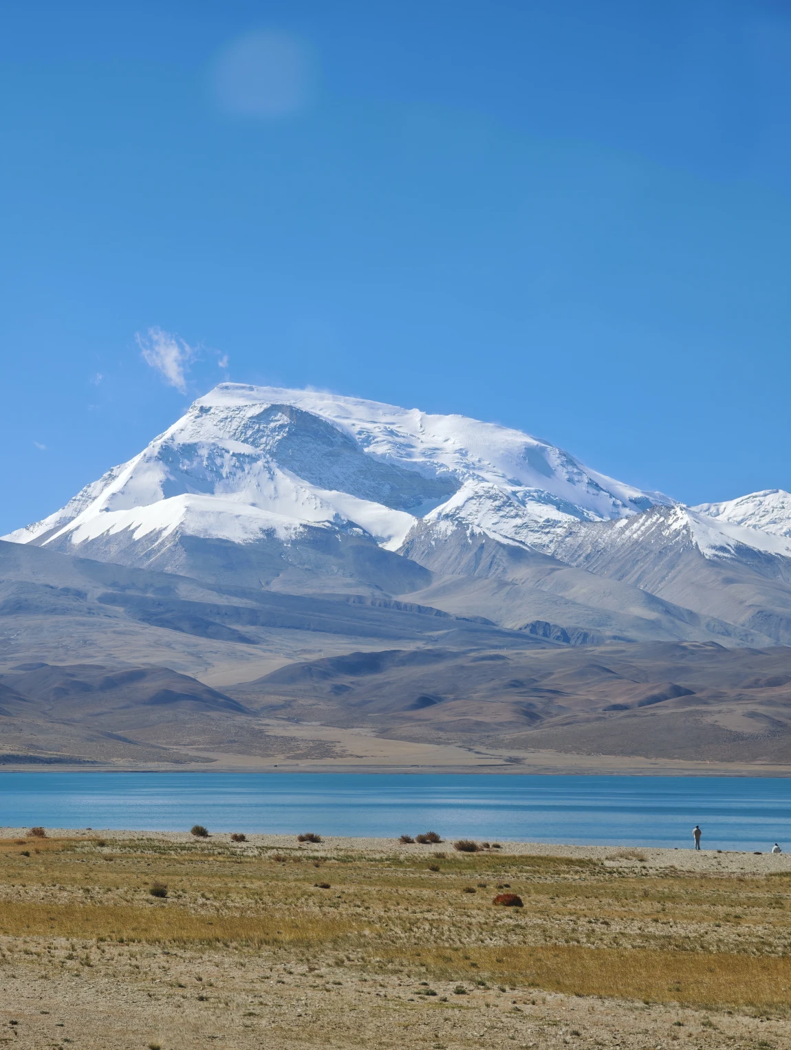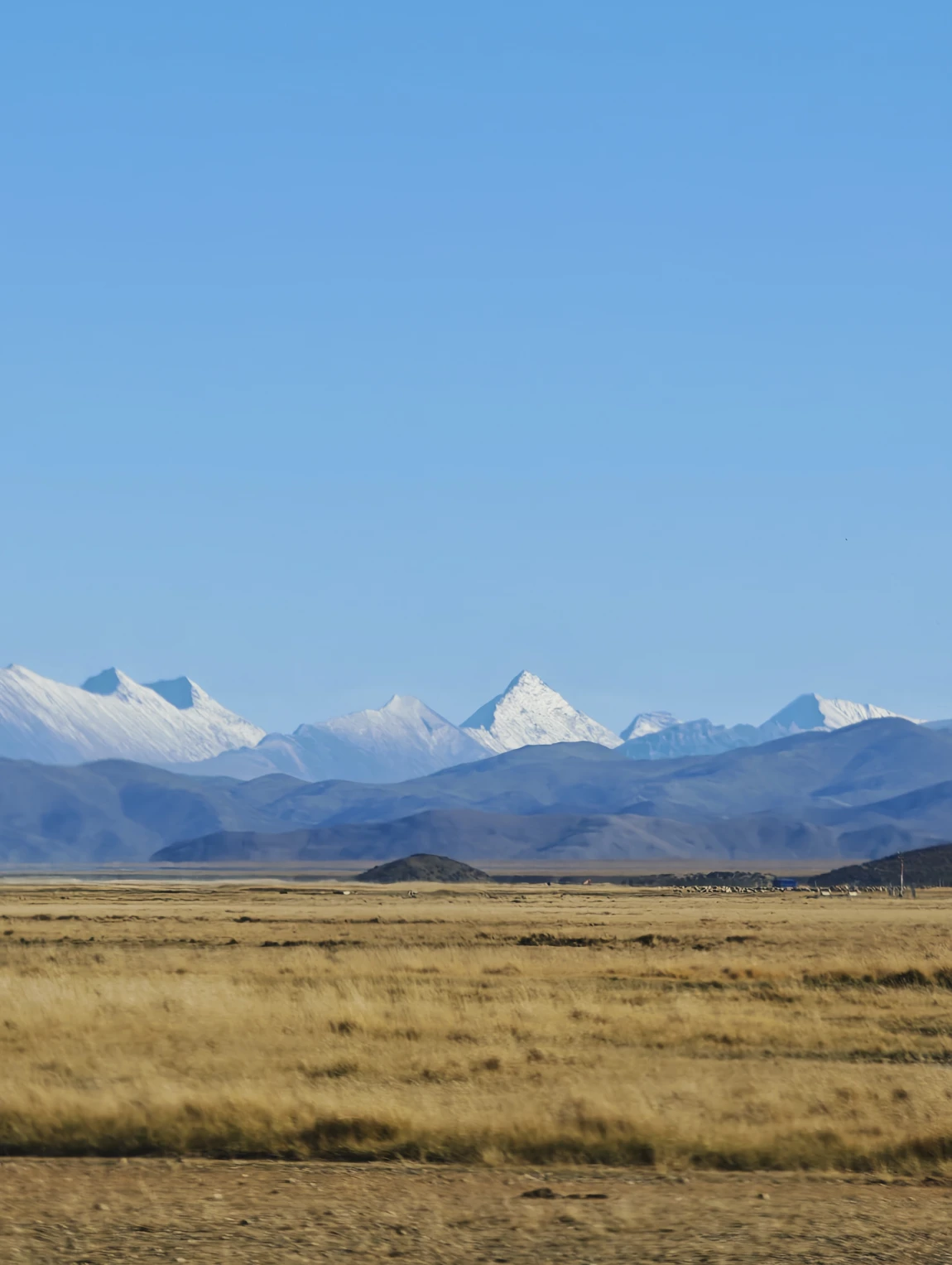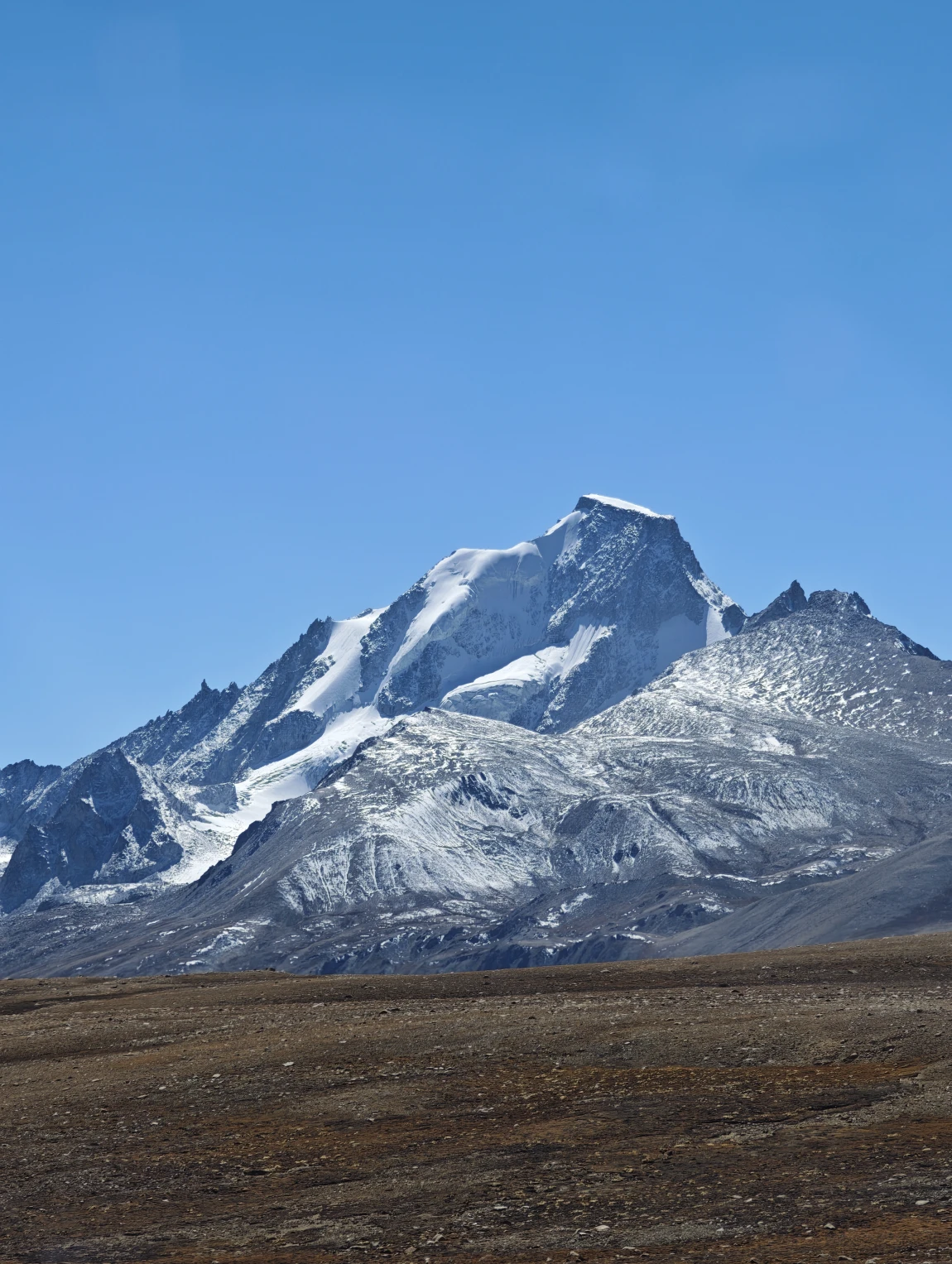 从边防公路绕出来是公珠错边境检查站,从这里右转向东就回到了219国道上了,前面会翻越一个5211的垭口,下去之后就一路平坦了。前往仲巴县的路上,远处可以看到一排雪山,这些雪山就是喜马拉雅山脉,有不少雪山都是在尼泊尔的境内,虽然看过去不高,但其实个个都是六七千米级的雪山,没有做功课,不知道他们都叫什么名字,其中有一座尖尖的像金字塔一样的雪山,应该就是国王峰吧。