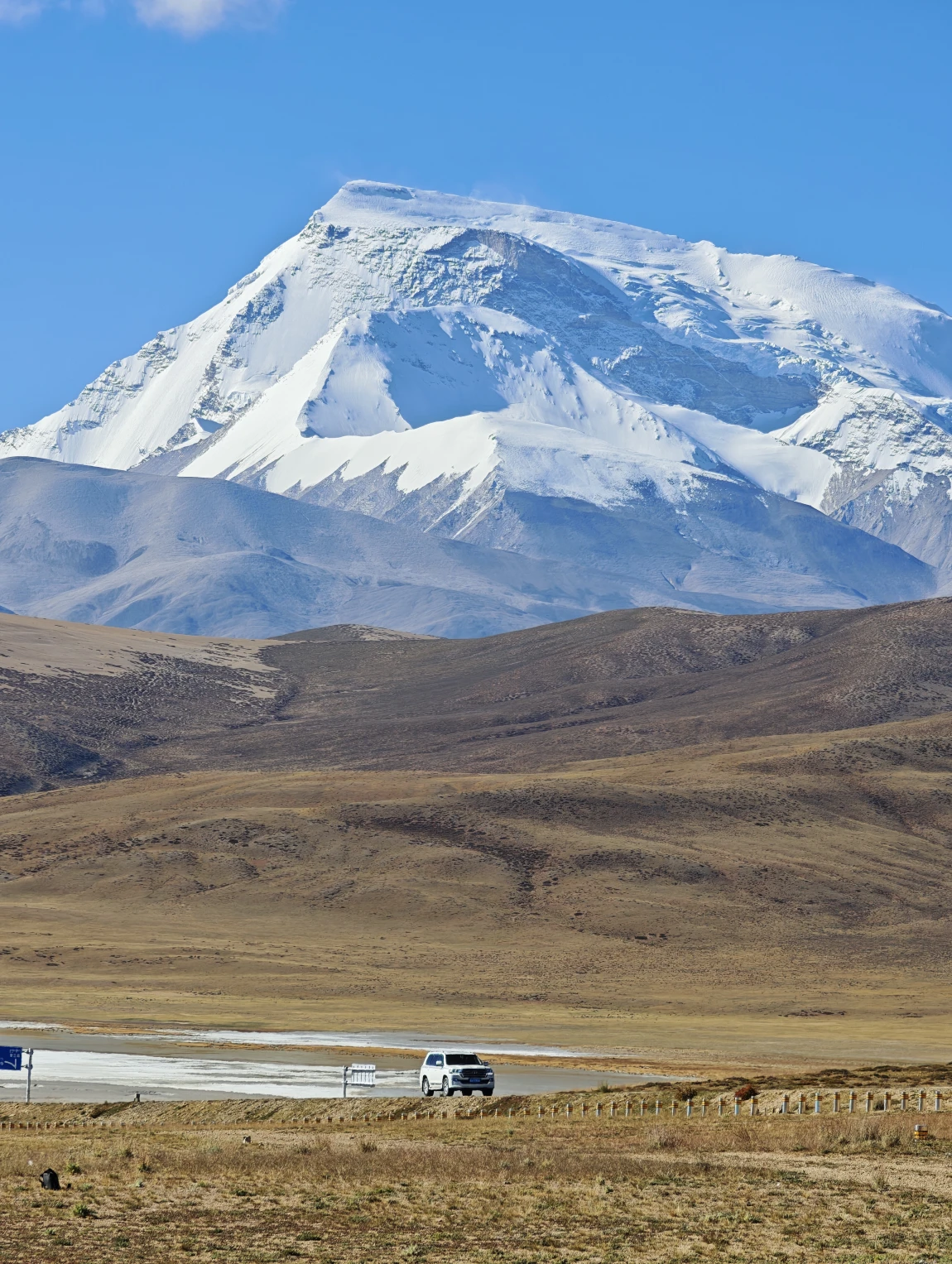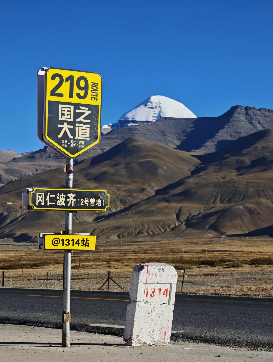 大本营距离纳木那尼有点远,但是没关系,我们可以从这里出发一路开到雪山脚下。导航拉昂错观景台,沿着219国道行驶几公里,会经过一个中石化加油站,然后走上南面的岔路。这条路全部是铺装路面,一直向着纳木那尼的方向前进,一路上雪山会变得越来越近。