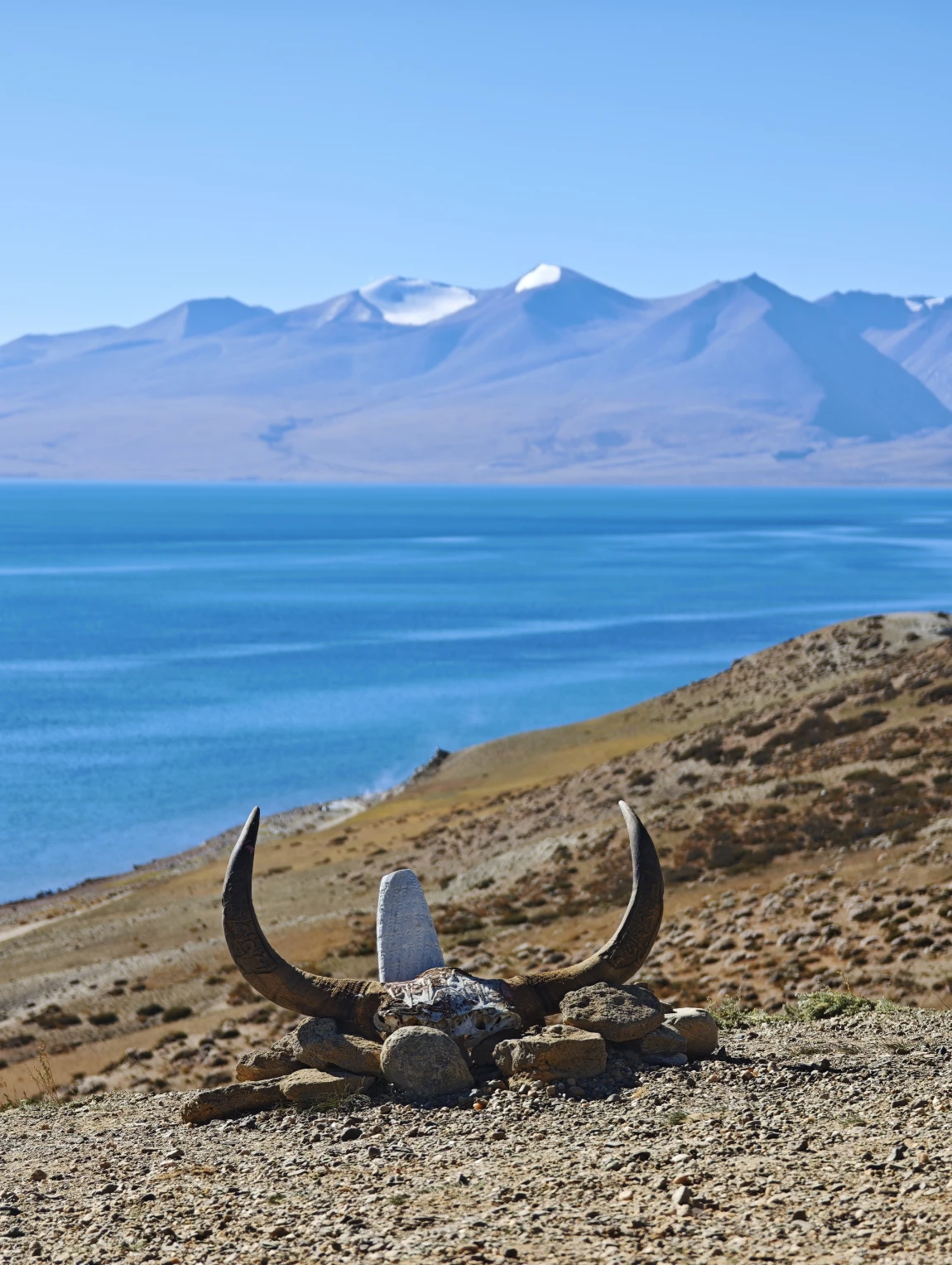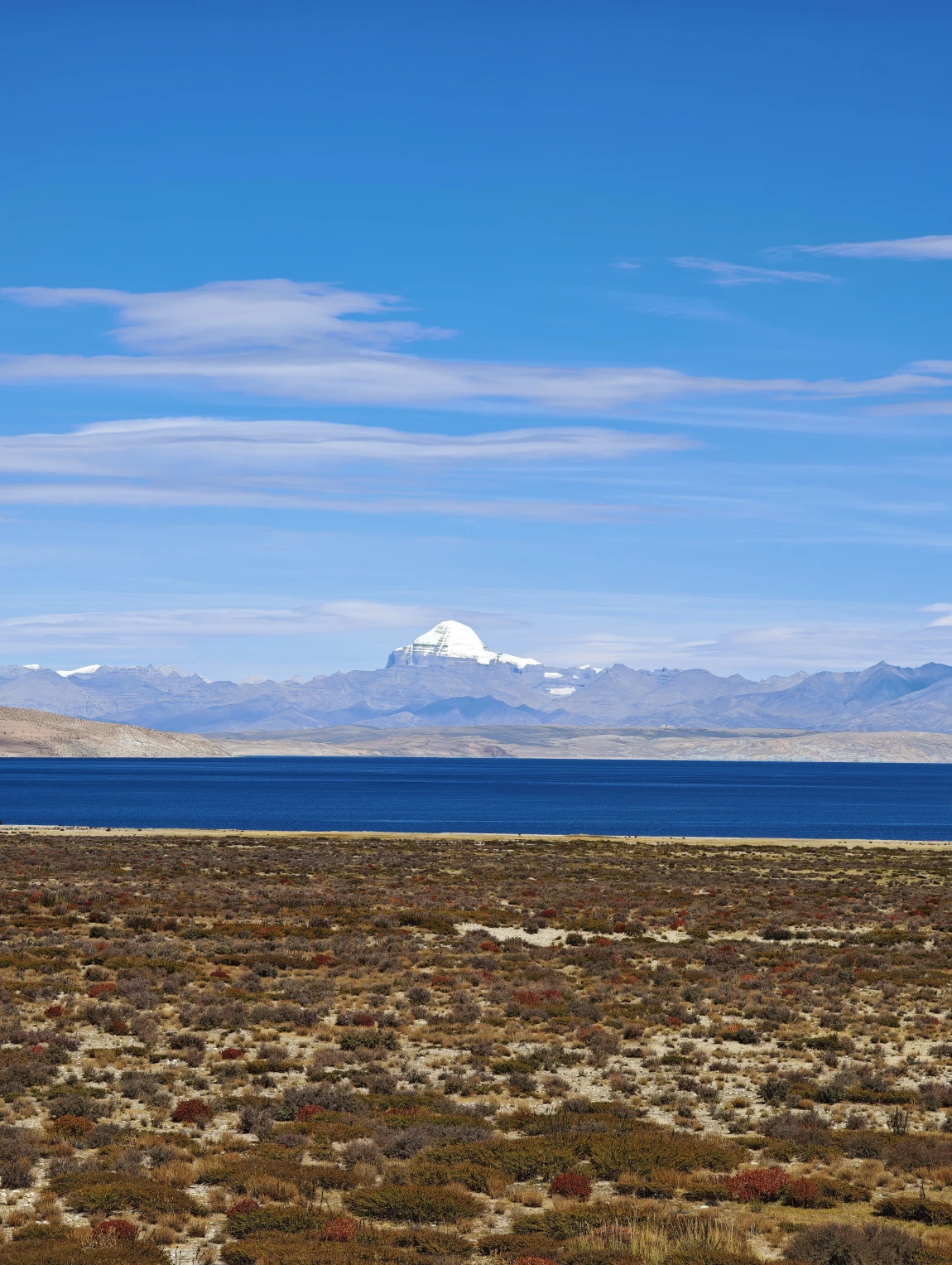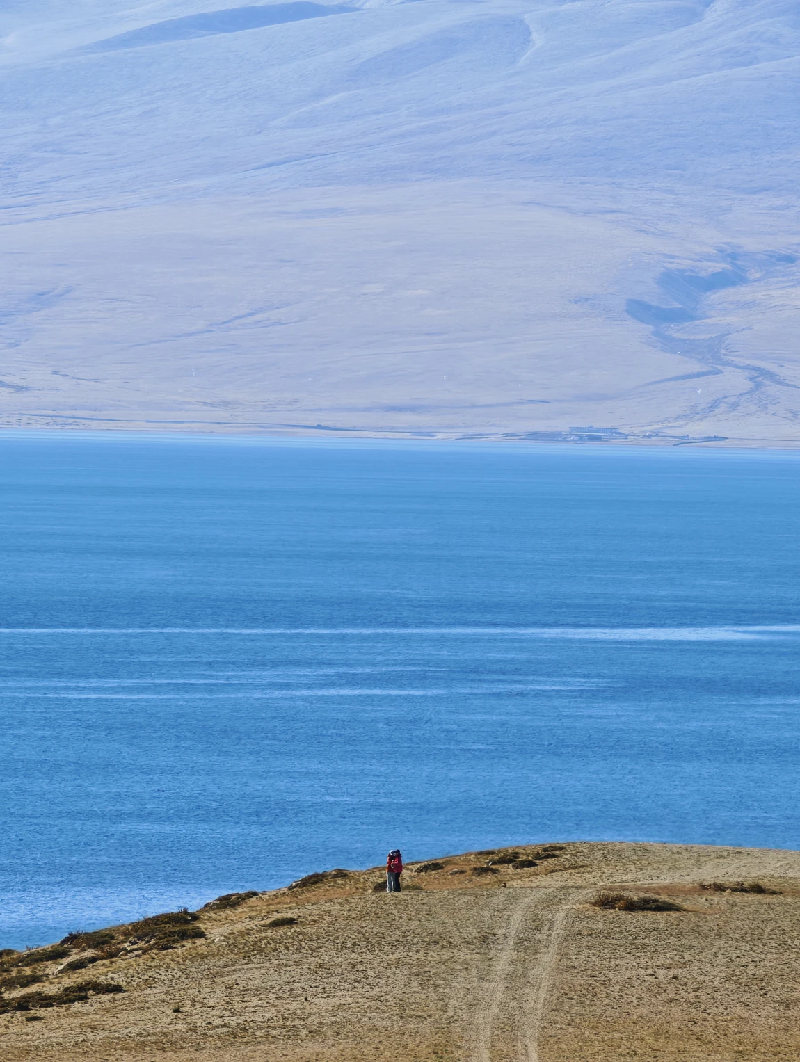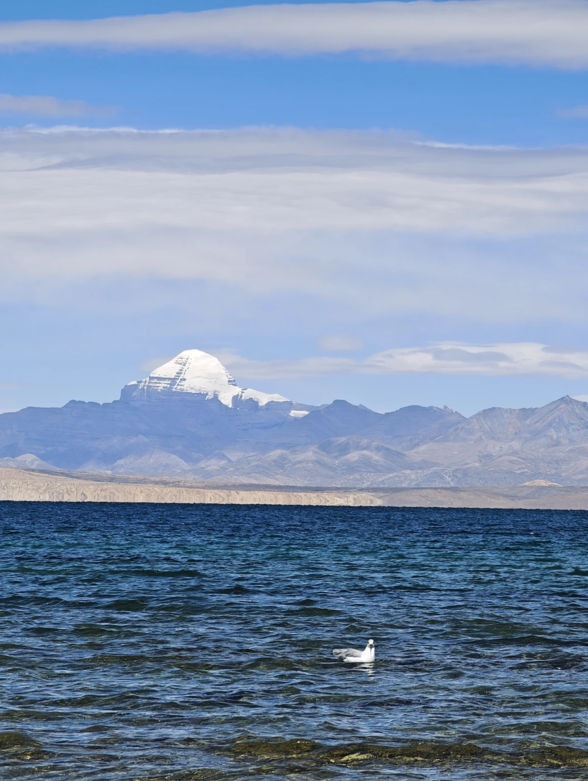 玛旁雍错给人的感觉是比较温暖舒适的,湖边的风不是很大,在阳光的直射下,湖面会呈现出蔚蓝的色彩,当阳光被云层遮挡后,湖面又变得幽蓝深邃。